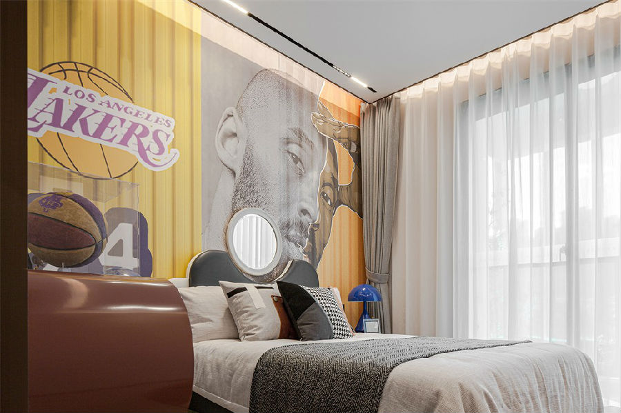 次臥則是兒子的天地,設(shè)計(jì)師以球類運(yùn)動(dòng)為主題,巧妙地在床頭設(shè)計(jì)了科比的形象墻和專屬序號。這不僅體現(xiàn)了男孩的個(gè)性與熱愛,更為這個(gè)空間增添了一份獨(dú)特的紀(jì)念意義。
