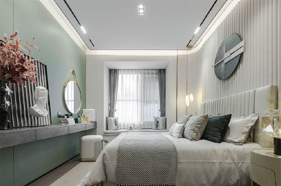 主臥室延續(xù)了客廳的整體色調(diào),奶綠色與灰色的交融,如同清晨的薄霧,清新而舒緩。一面墻的涂刷與其他白色區(qū)域形成鮮明對比,宛如一幅水墨畫,勾勒出居室的寧靜與雅致。