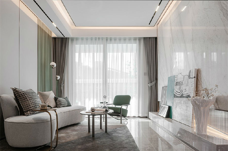 整體色調(diào)淡雅清新,如同初春的晨露,給人帶來寧靜與舒適。石材打造的電視墻,簡約而不失現(xiàn)代感,宛如一幅未經(jīng)雕琢的畫卷,自然流露出整潔與光澤。