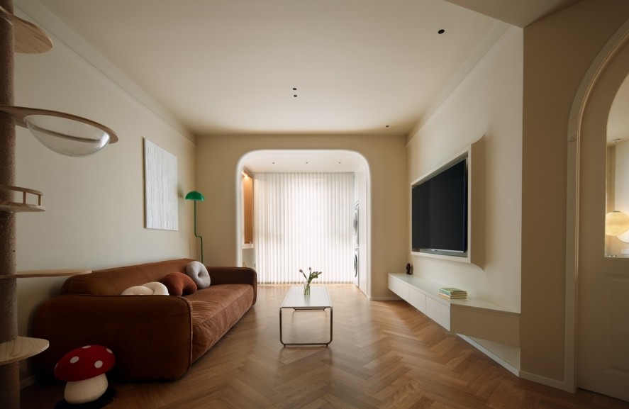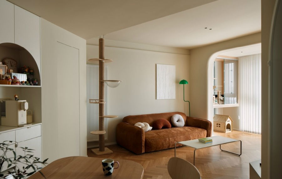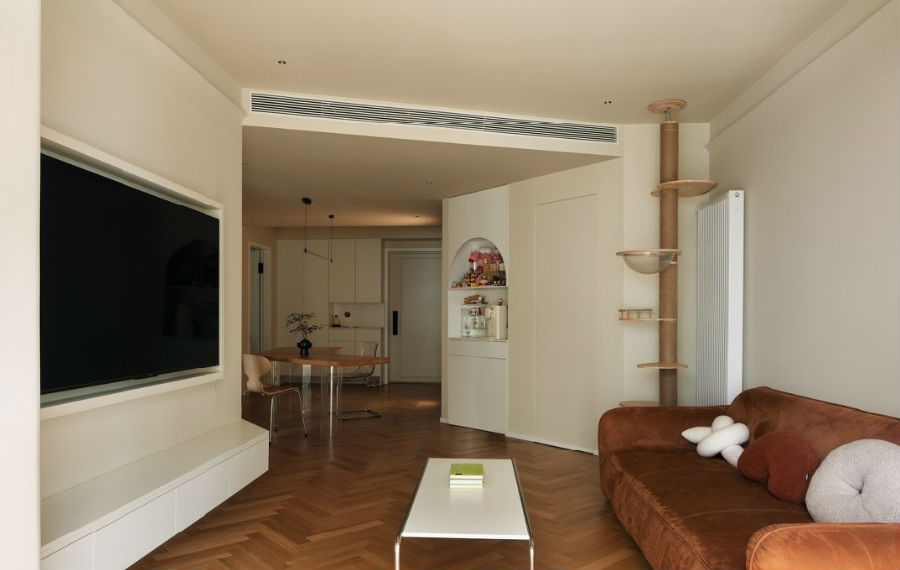 客廳的設(shè)計(jì)同樣充滿巧思。沙發(fā)旁設(shè)計(jì)了兩處寵物玩樂(lè)區(qū),既滿足了業(yè)主的養(yǎng)寵需求,又保證了空間的獨(dú)立性。開(kāi)放式弧形展示柜巧妙地將藏品展示與水吧功能結(jié)合,既美觀又實(shí)用,滿足了業(yè)主日常飲水的需求。
