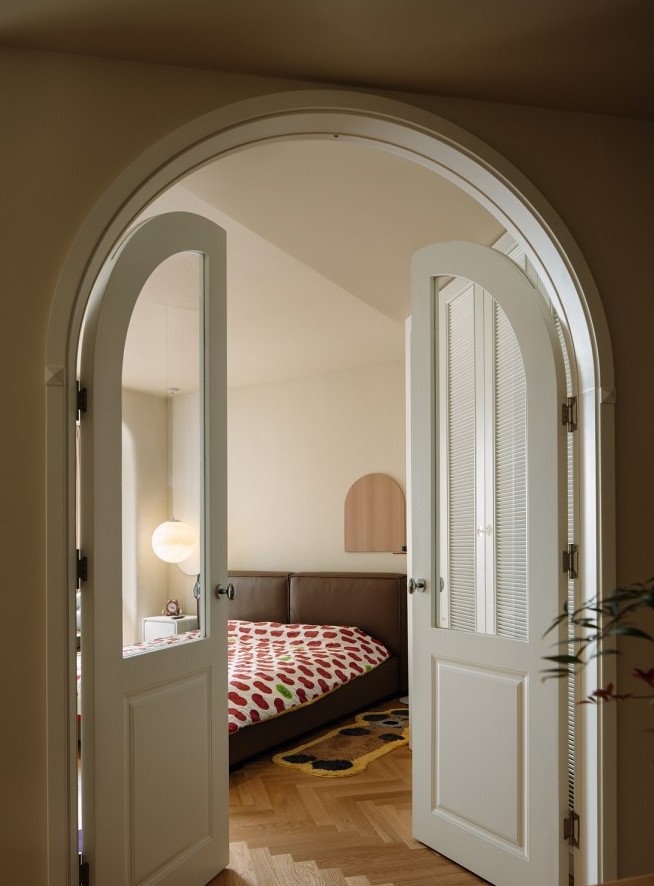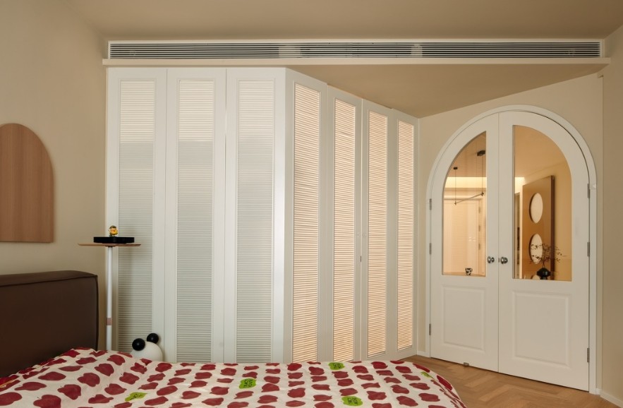 臥室的設(shè)計(jì)更是獨(dú)具匠心。無(wú)把手設(shè)計(jì)、不規(guī)則的鏡子門、圓弧鑲嵌鏡面等細(xì)節(jié)處理,不僅讓空間顯得更為開(kāi)闊,還解決了玄關(guān)沒(méi)有穿衣鏡的問(wèn)題。圓形雙開(kāi)玻璃拱門和主臥定制圓弧雙開(kāi)門的設(shè)計(jì),更是將浪漫與優(yōu)雅完美融合,提升了整個(gè)空間的氣質(zhì)。