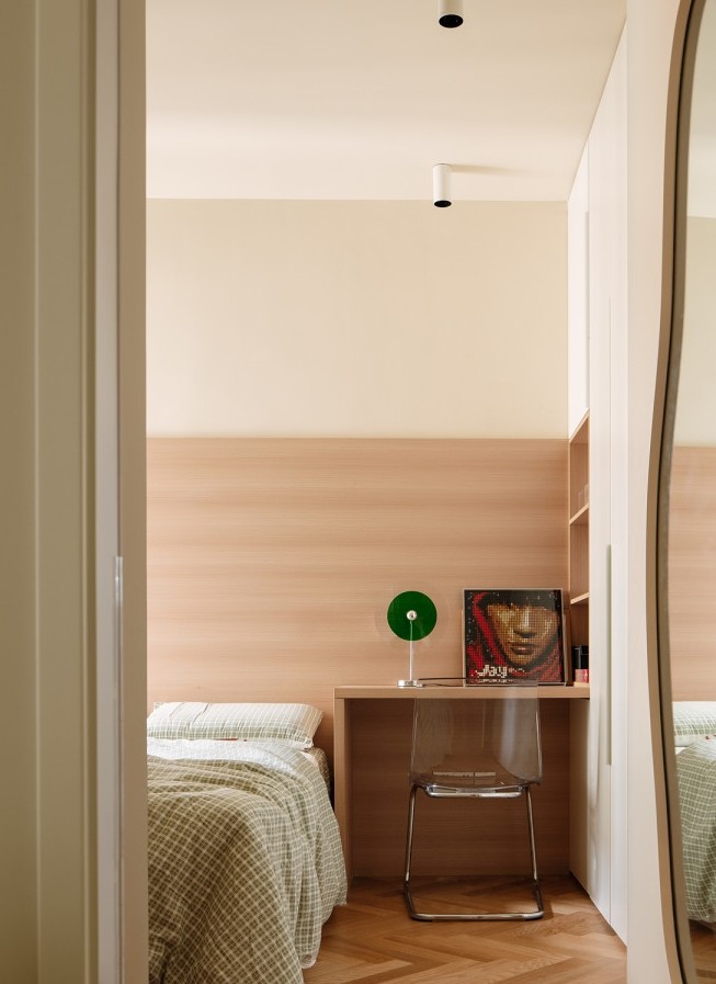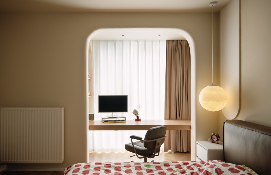 衣帽間的設(shè)計(jì)同樣出色。雙開(kāi)折疊百葉門自帶浪漫氛圍,同時(shí)保證了空間的透氣感。書桌同色木飾面造型搭配球形吊燈,圓弧呼應(yīng)整體空間線條,增添了臥室的溫柔氣質(zhì)。