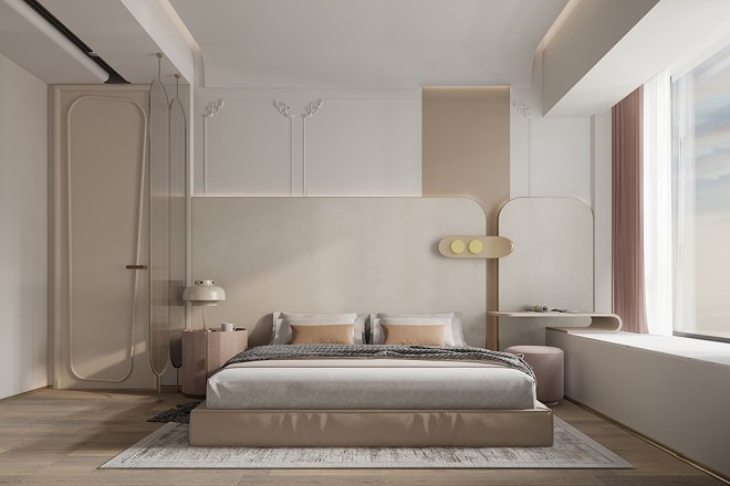 主臥則延續(xù)了整體的奶油色調(diào),從進(jìn)門到床頭背景墻,雙弧邊屏風(fēng)式造型如絲綢般順滑,溫柔地鋪陳一室。充滿設(shè)計感的圓形壁燈散發(fā)著優(yōu)雅的光芒,為每一個夜晚增添了一份藝術(shù)氣息。懸浮式梳妝臺的巧妙設(shè)計,讓空間靈動輕盈,絲毫不顯堆砌感,反而讓人感受到一種慢下來的輕快與明朗。