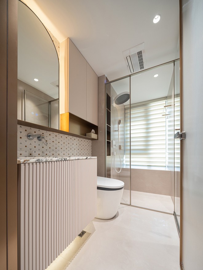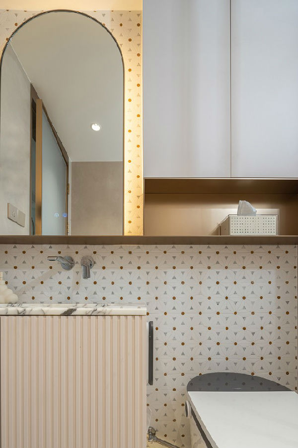 衛(wèi)生間同樣沿用了奶油色系和弧形設(shè)計,整體氛圍和諧統(tǒng)一。洗漱臺底部的懸空設(shè)計不僅增加了空間層次感,還減少了衛(wèi)生死角。透明玻璃推拉門分隔干濕區(qū)域,保持通透感的同時又不影響空間的采光。墻面部分采用波點+三角形花紋瓷磚設(shè)計,獨特紋理和立體感讓空間更具藝術(shù)氣息,為日常洗浴時刻帶來滿滿的儀式感和放松感受。