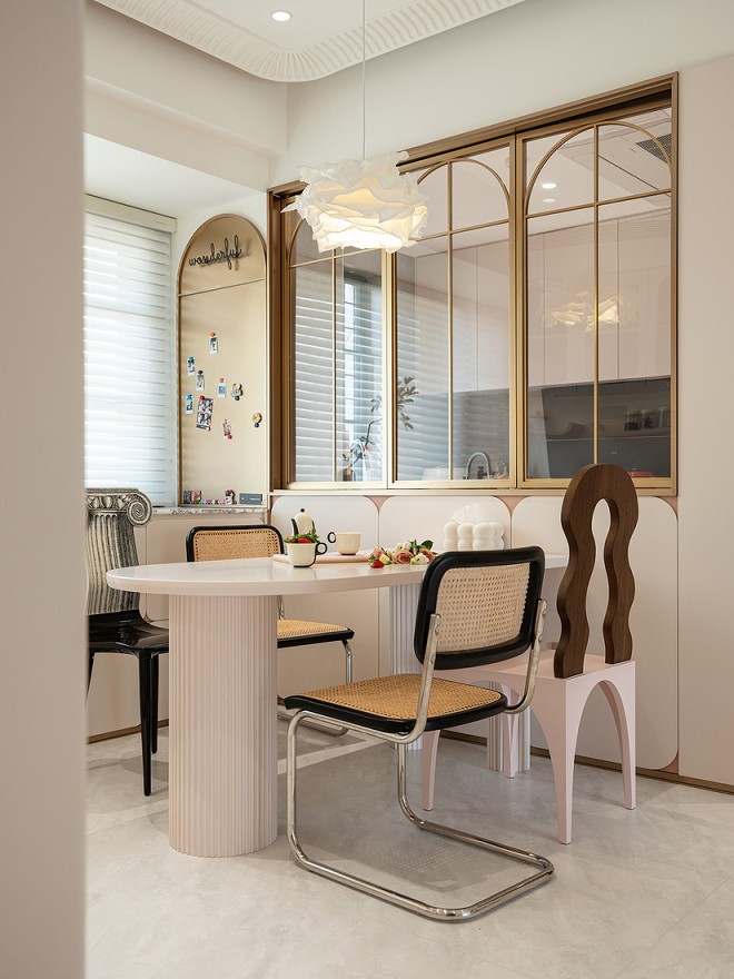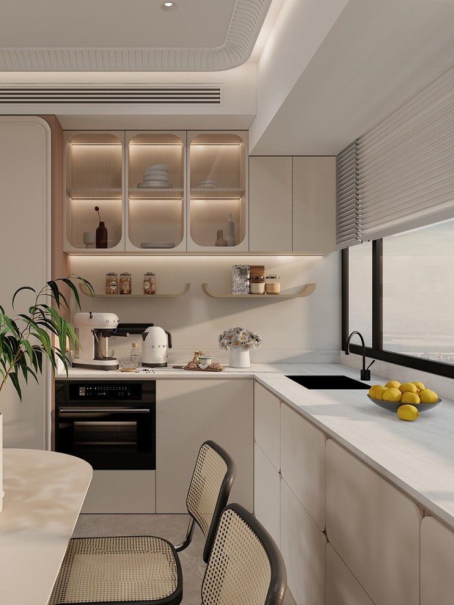廚房則巧妙地將冰箱、烤箱等電器隱藏在餐廳柜后,極大地拉伸了空間尺度。順沿墻面設(shè)計的淡粉與奶白交織的櫥柜,部分搭配長虹玻璃和弧形設(shè)計,每一處細(xì)節(jié)都精致而舒適,讓人感受到家的溫馨與便利。