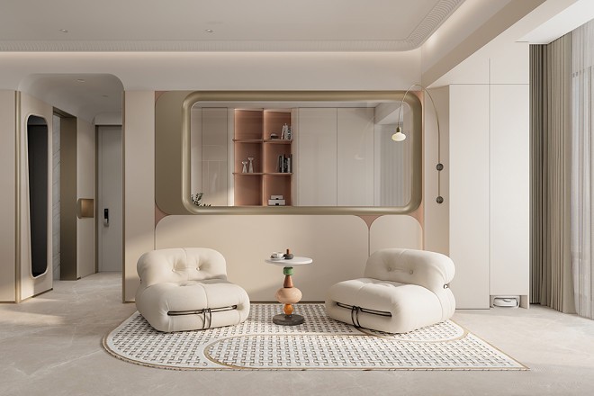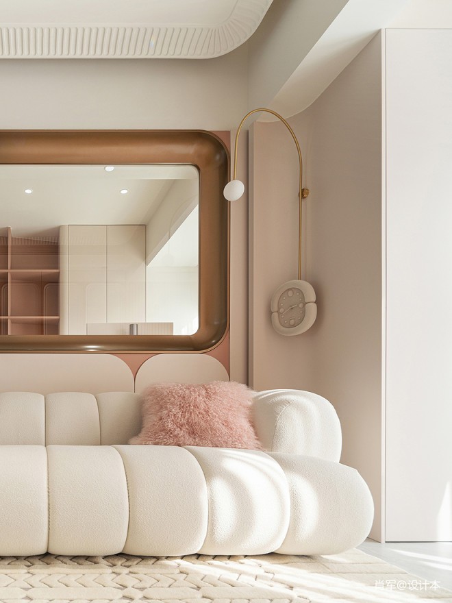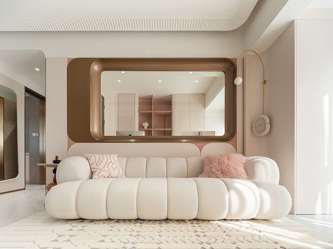 客廳的另一面,圓潤飽滿的曲線勾勒出一個溫馨柔和的休憩空間。軟乎乎的奶白沙發(fā)與弧形設(shè)計相呼應(yīng),Q彈豐盈的體積感仿佛在訴說著家的溫馨與舒適。鋪上仿若奶油編織的絨毛地毯,整個空間彌漫著溫暖松弛的氛圍,讓人仿佛置身于一個甜蜜的夢境。