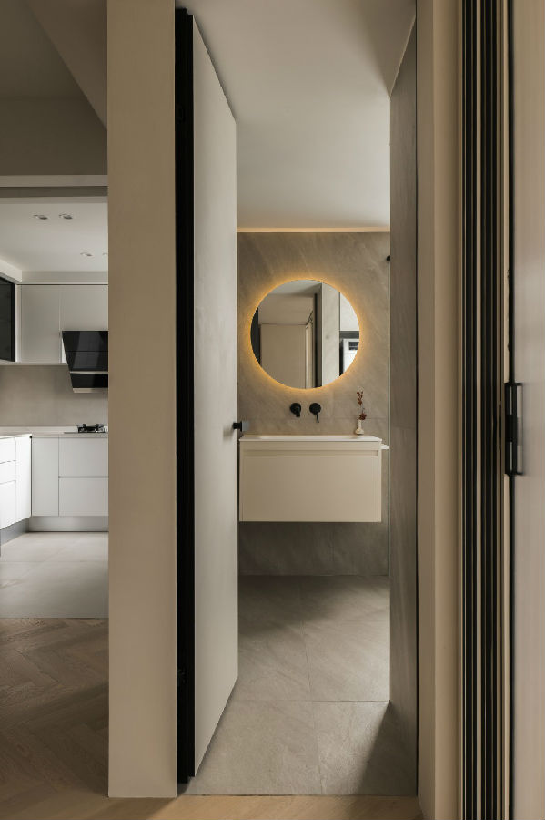 衛(wèi)生間的布局同樣經(jīng)過(guò)精心考量,將干區(qū)設(shè)置在正對(duì)門(mén)體的方位,既美觀又實(shí)用。懸空式浴室柜、一體式臺(tái)盆、入墻式水龍頭和圓形浴室鏡的搭配,簡(jiǎn)潔大方,既提升了衛(wèi)生間的顏值,又增強(qiáng)了實(shí)用性。