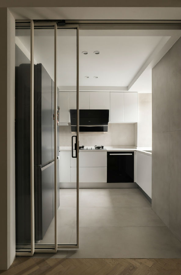 廚房設(shè)計(jì)同樣出彩,采用上軌道玻璃移門(mén),合起來(lái)時(shí)可以藏進(jìn)墻壁后,瞬間變?yōu)殚_(kāi)放式廚房。需要時(shí)展開(kāi),能有效隔絕油煙,既便利又美觀。廚房地面鋪貼地磚,與餐廳的木地板采用無(wú)壓條拼接技術(shù),視覺(jué)上更加簡(jiǎn)約美觀。墻地一體的設(shè)計(jì),讓空間顯得更為開(kāi)闊舒適。