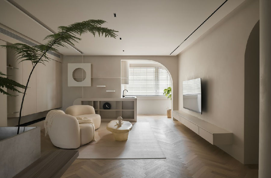 在色彩搭配上,客廳以素雅安靜的低飽和色為主,奶油色系的運(yùn)用讓空間在保持清簡(jiǎn)寧?kù)o的同時(shí),也散發(fā)出家的溫馨和溫度。平面吊頂、無(wú)主燈設(shè)計(jì)以及同色系的軟裝,使空間視覺(jué)更加和諧統(tǒng)一。與陽(yáng)臺(tái)之間的門(mén)洞采用弧形線條勾畫(huà),結(jié)合奶油色調(diào),更顯溫柔流暢。