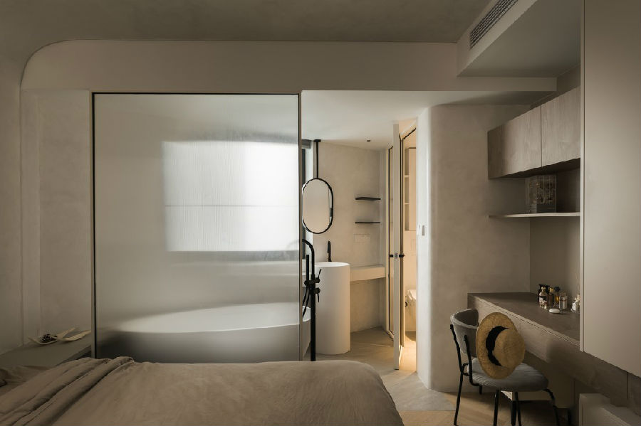 主臥內(nèi)的異形區(qū)域被設(shè)計(jì)師巧妙地劃分為洗手間干區(qū)與浴缸區(qū),墻角位置打造了一個(gè)3平方左右的馬桶區(qū)。干區(qū)與臥室之間采用長(zhǎng)虹玻璃作為隔斷,既保持了空間的通透感,又起到了遮擋作用,既實(shí)用又美觀。