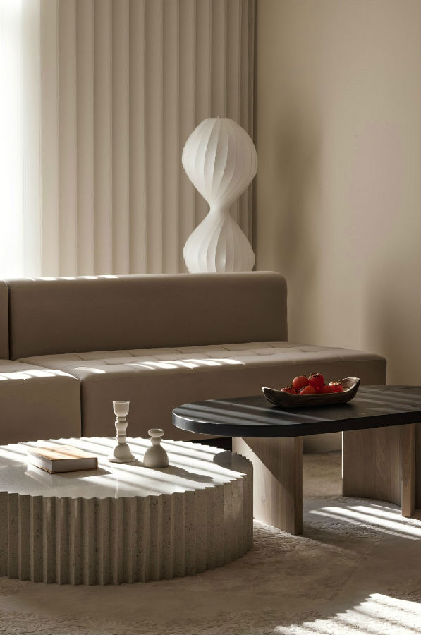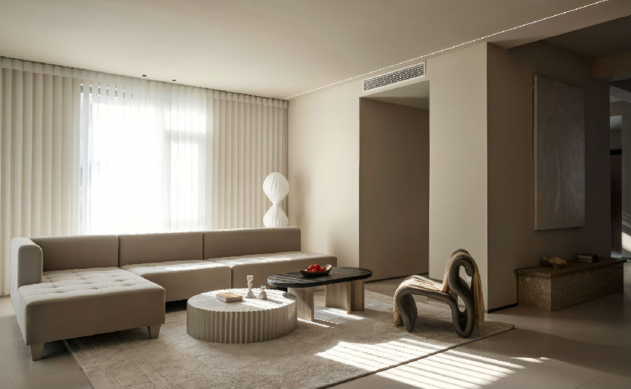 在客廳設(shè)計(jì)中,設(shè)計(jì)師采用L型沙發(fā)不靠墻的布局,形成“洄游動(dòng)線”,增強(qiáng)了家庭交互區(qū)的樂趣。沙發(fā)后方的蠶絲落地?zé)艉湾e(cuò)落有致的茶幾組合,營(yíng)造出隨意慵懶的氛圍。陽(yáng)光透過紗簾投射在沙發(fā)上,營(yíng)造出溫馨舒適的家居氛圍。
