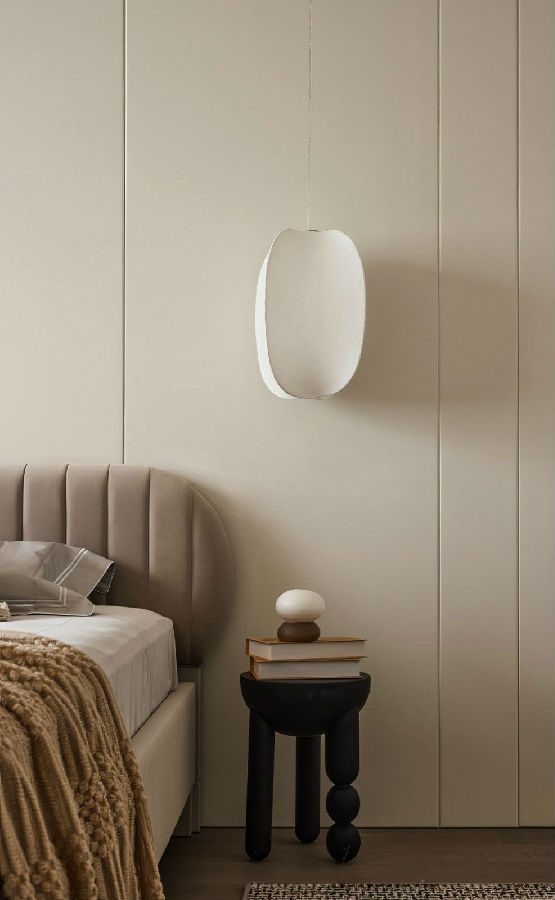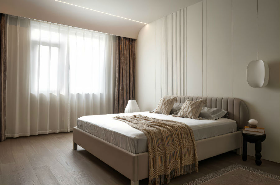臥室設(shè)計(jì)中,主臥空間以業(yè)主夫妻的休憩需求為主,配色延續(xù)整體風(fēng)格,簡(jiǎn)潔而不失溫馨。床頭隨意擺放的木凳和幾本書籍,增添了幾分隨意、慵懶的氛圍。