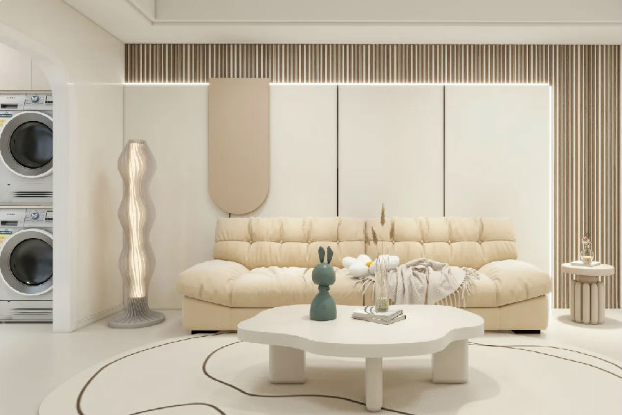 在客廳,整體色調(diào)以暖色弱對(duì)比為主,柔軟圓潤(rùn)的軟裝配飾為奶油風(fēng)注入了更多溫馨氛圍??筒蛷d一體的設(shè)計(jì),不僅節(jié)省了空間,還在餐桌旁貼心布置了水槽,方便清洗餐具。