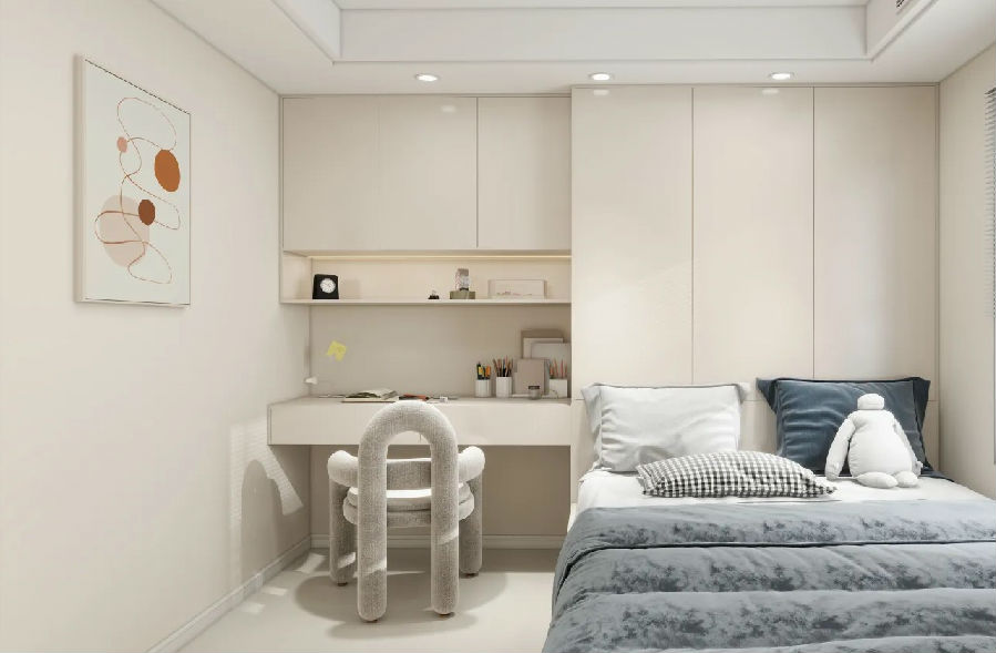 臥室墻面采用淺米奶油色,為居住者營(yíng)造了一個(gè)寧靜舒適的休息空間。小孩房則延續(xù)了奶油風(fēng)色調(diào),整體家具及墻面均使用了淺米奶油色,為孩子創(chuàng)造了一個(gè)溫馨的成長(zhǎng)環(huán)境。