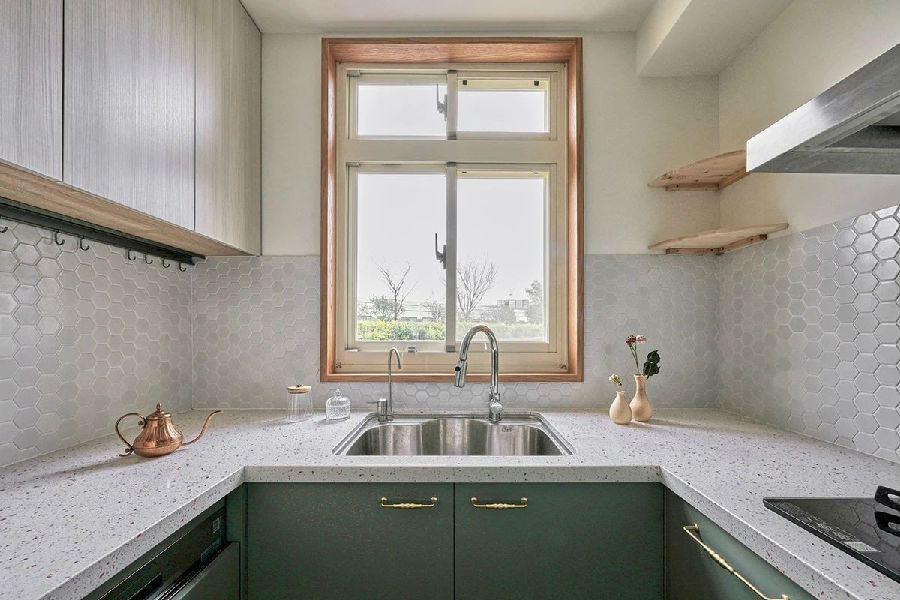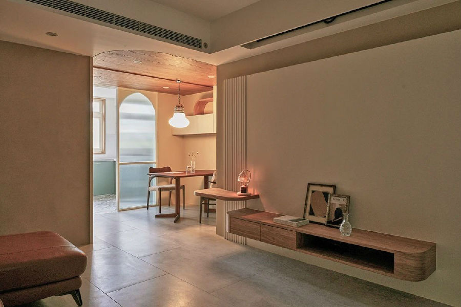 進(jìn)入廚房前,推開(kāi)與餐廳天花相似的弧面門框,你會(huì)發(fā)現(xiàn)門片在開(kāi)合之間,正流動(dòng)著不同彎弧曲線,為廚房帶來(lái)了別樣的想象力。這種設(shè)計(jì)不僅美觀,還增加了廚房的實(shí)用性和趣味性。