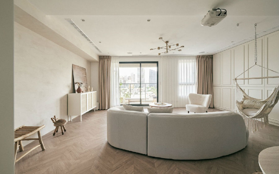 設(shè)計師巧妙地將沙發(fā)放置在客廳中央,正面朝向大幅窗景,使采光更加充足。同時,以投影布幕代替?zhèn)鹘y(tǒng)的電視墻,打造出更加靈活的娛樂空間。圓弧沙發(fā)則成為客餐廳之間的獨特設(shè)計元素,讓這里可以變成小型劇院、晨間咖啡館或運動游戲場等多種生活場景。