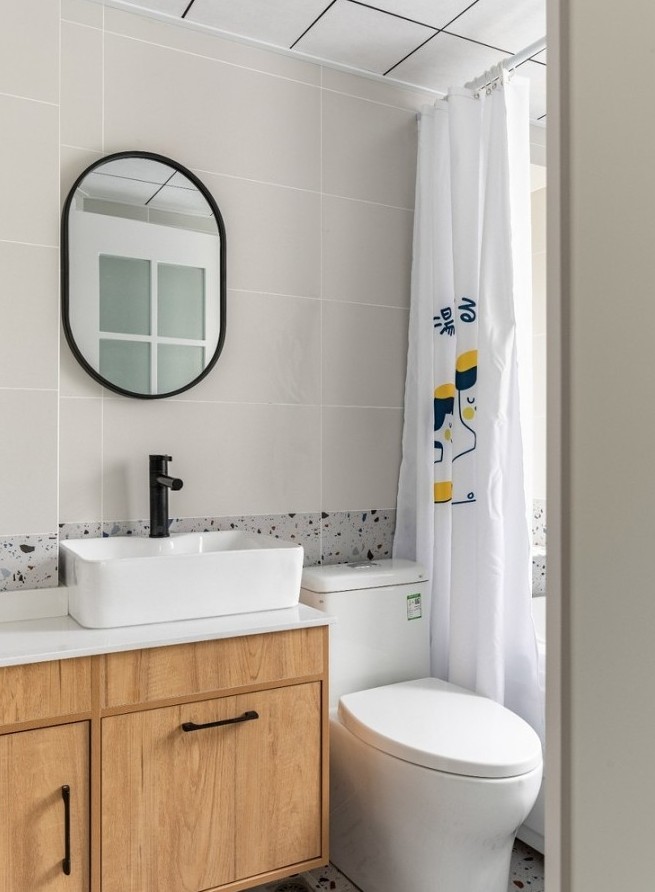 衛(wèi)生間則以干凈利落的線條勾勒出硬朗的衛(wèi)浴空間,地面瓷磚選用不規(guī)則圖案,與頂上的小方形扣板相呼應(yīng),為空間注入了滿滿的活力和時(shí)尚感。原木的洗手盆材料與整體極其融洽,既實(shí)用又美觀。