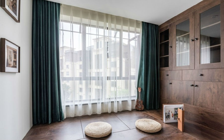客廳的設(shè)計(jì)更是令人眼前一亮,落日橙背景墻與墨綠配色的碰撞,讓整個(gè)空間充滿了活力與時(shí)尚感。大膽的配色不僅彰顯了業(yè)主對(duì)生活的“不羈”態(tài)度,更讓整個(gè)空間煥發(fā)出獨(dú)特的魅力。同時(shí),客廳還加入了一個(gè)榻榻米休閑區(qū),大窗戶采光極好,墨綠色與天然原木家具相得益彰,集收納、休閑、看書、冥想、聊天為一體的多維度空間,美觀與實(shí)用并存。
