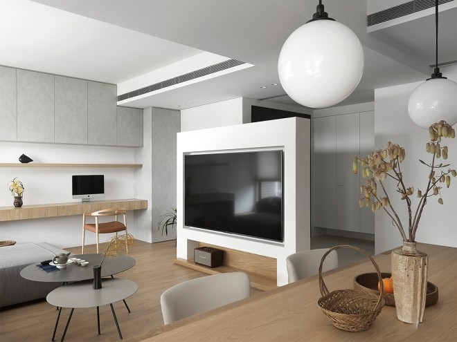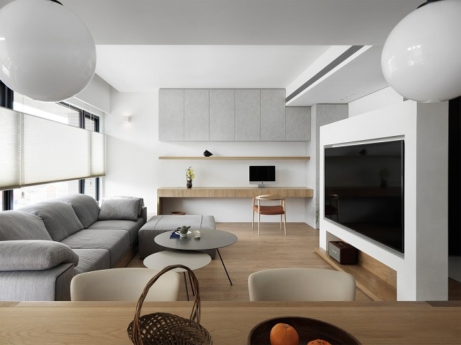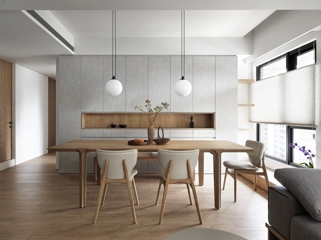 餐廳設計同樣精彩,垂吊的線性圓燈凸顯設計的立體感。餐廳灰色背景墻上的長條凹槽,既可用于收納雜物,又可作為裝飾欣賞。
