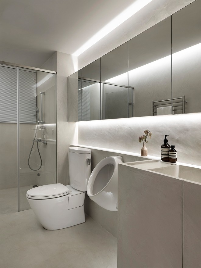衛(wèi)生間采用干濕分離設計,以白調與灰調為主,冷硬而理智。馬桶與小便池的設置更加干凈衛(wèi)生,方便實用。設計師還增強了洗手臺的收納功能,并放置了臺盆小景,使整體空間更加美觀協(xié)調。
