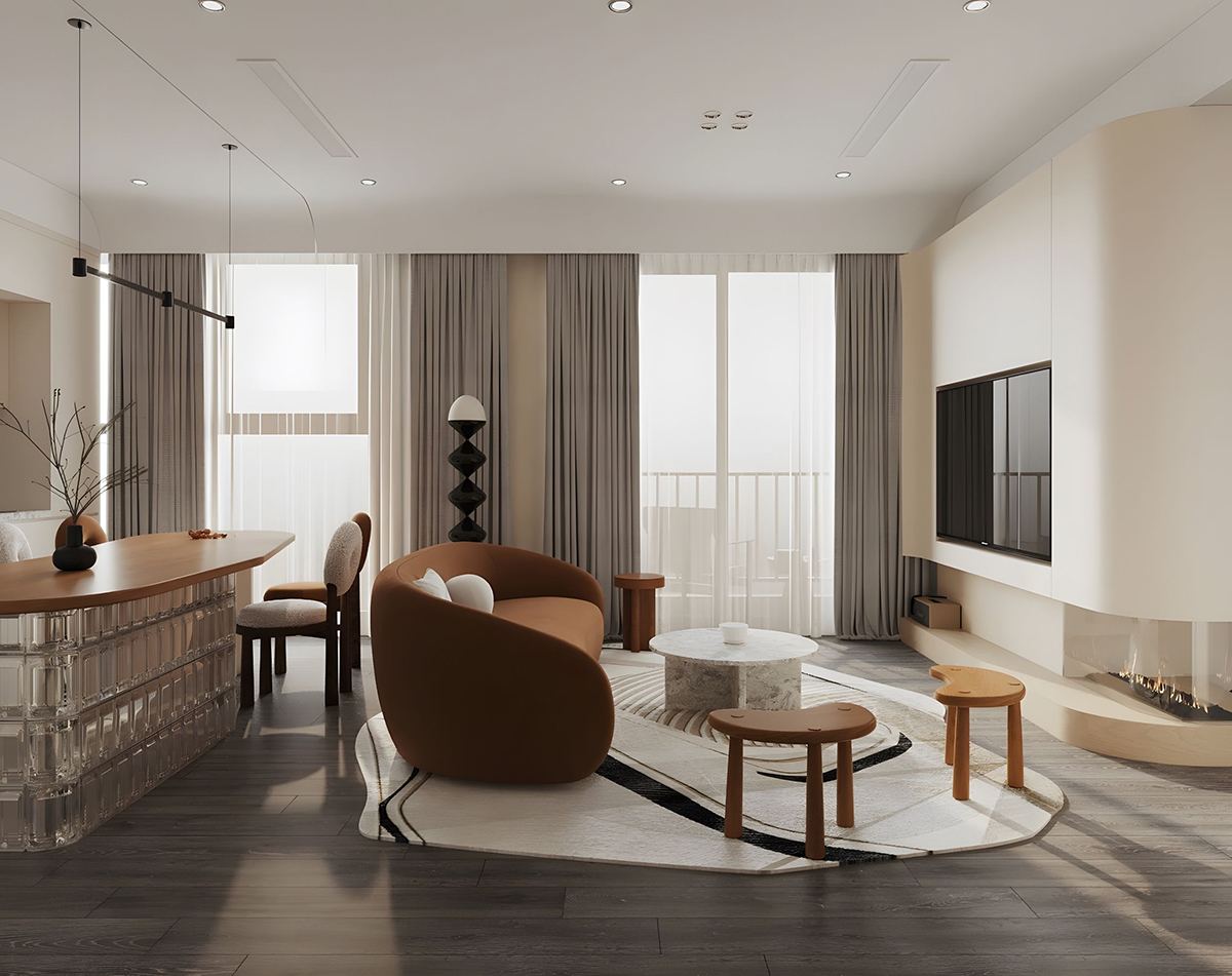 客廳使用頻率高,兼顧的功能也比較多。除了一般的視聽(tīng)區(qū)域,有些面積比較大的客廳還設(shè)置了就餐、學(xué)習(xí)、吧臺(tái)、榻榻米等區(qū)域。因此,布局一定要分明、合理。在設(shè)計(jì)上,可以利用隔斷、家具、屏風(fēng)、鋪設(shè)地毯等方式,將休閑區(qū)域和特殊區(qū)域分割開(kāi)來(lái),用軟硬裝結(jié)合的方式讓各部分功能更加具體、層次分明。