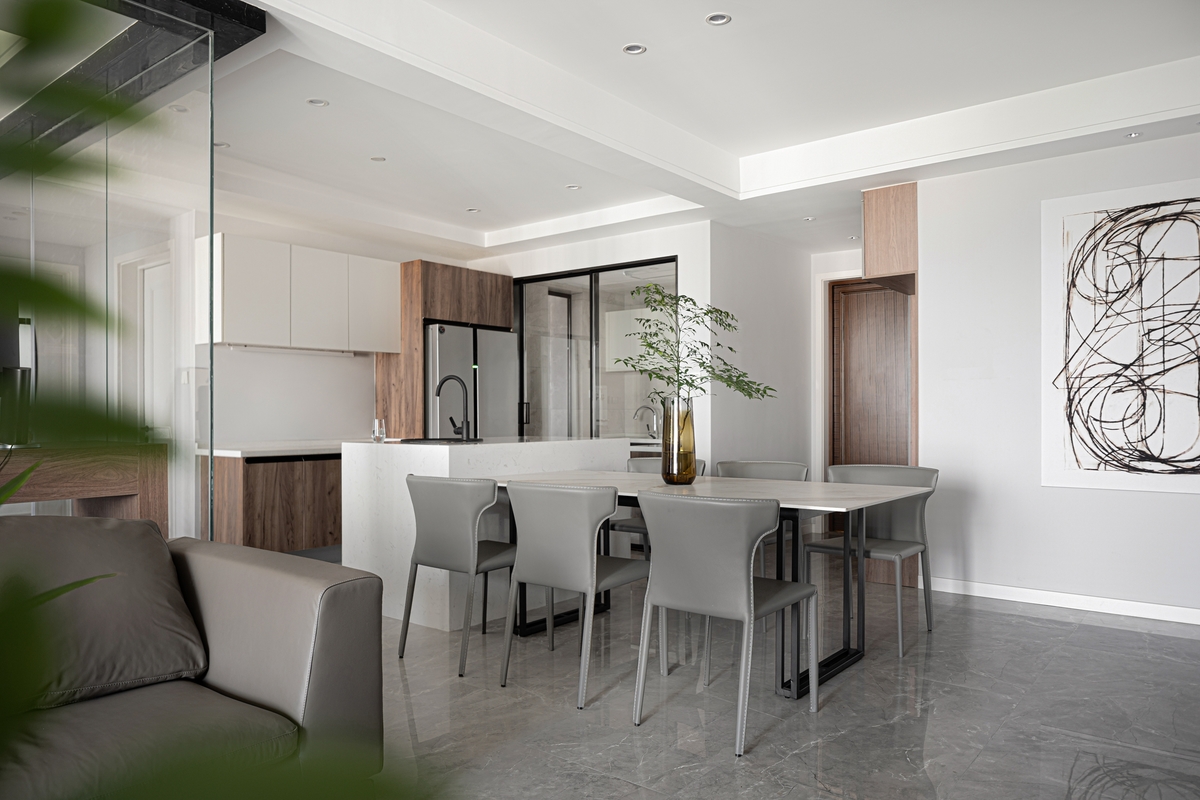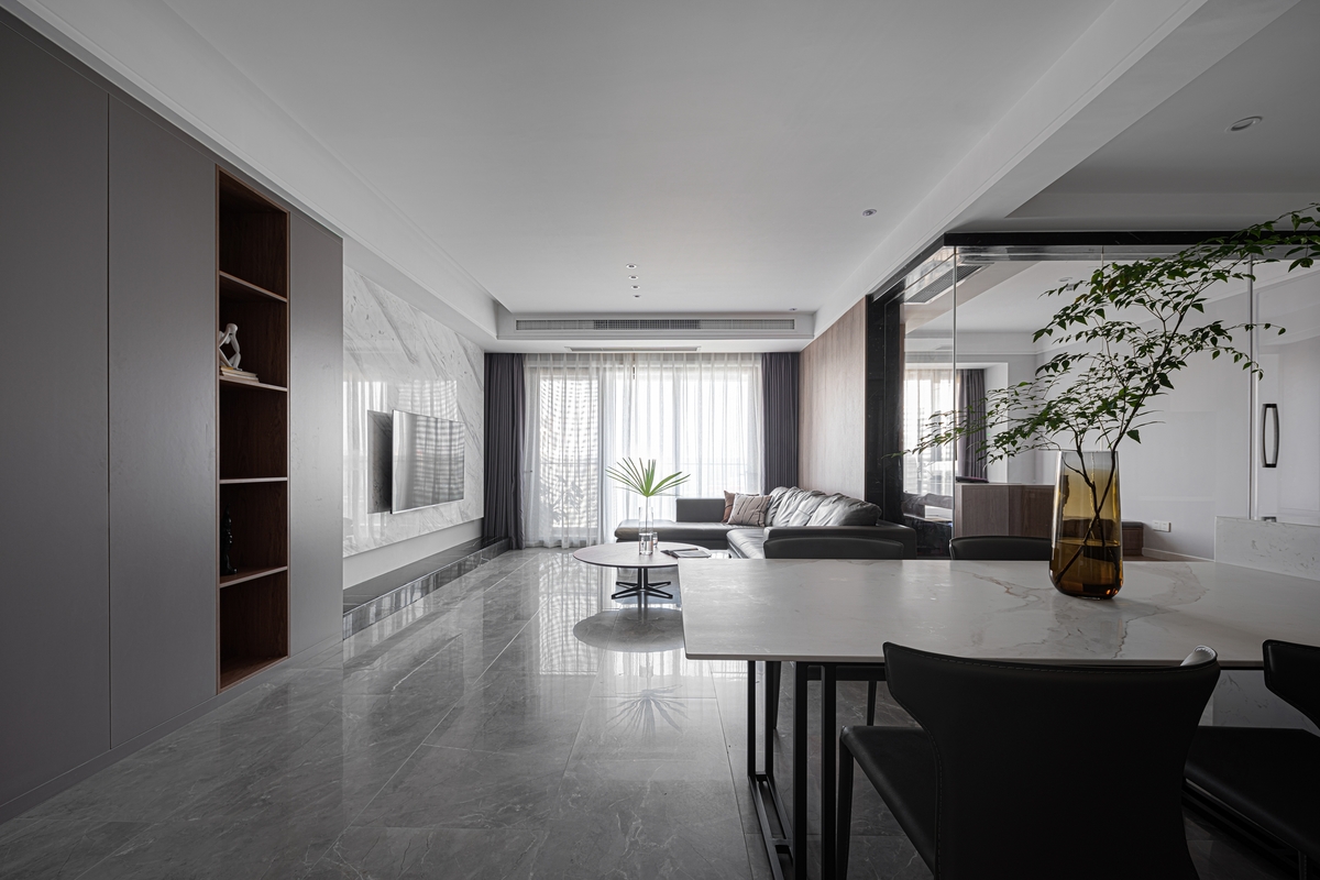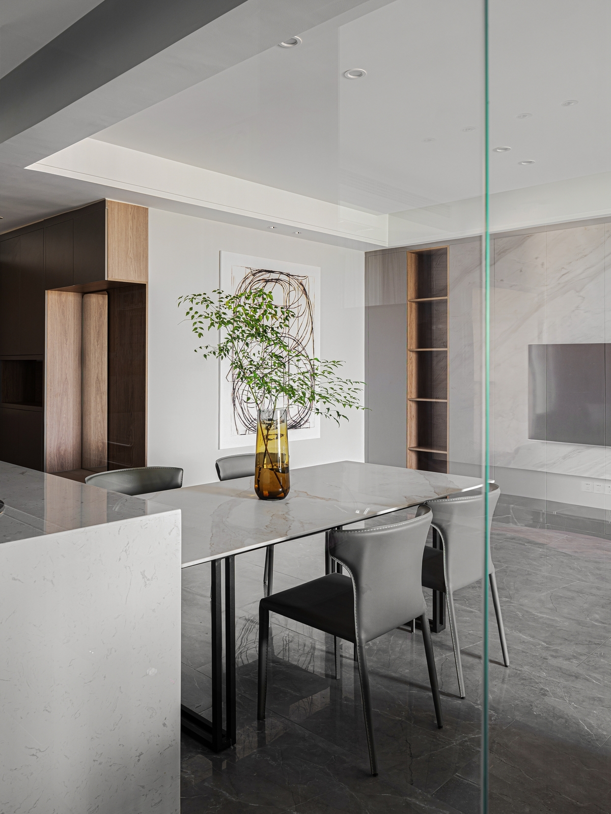 打破界限,用漸進的分界取而代之。冰川灰墻面、鋼灰色柜門、白色大理石電視墻,擬以意境表達品味。在冷靜的色彩、簡潔的線條、卓越的工藝協(xié)調下,給人以自然隨意之感,卻又讓每一處空間,都低調而不失精致。