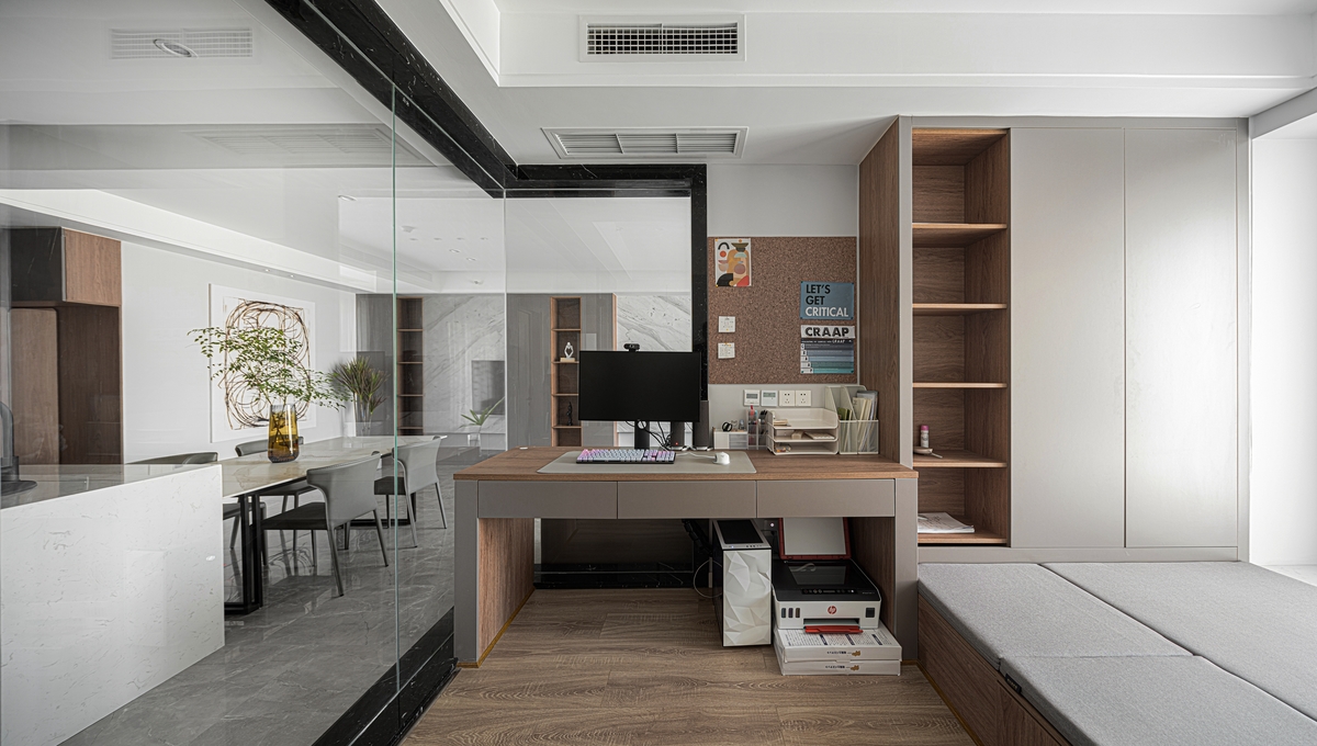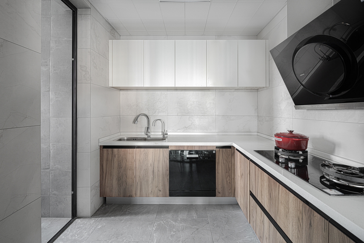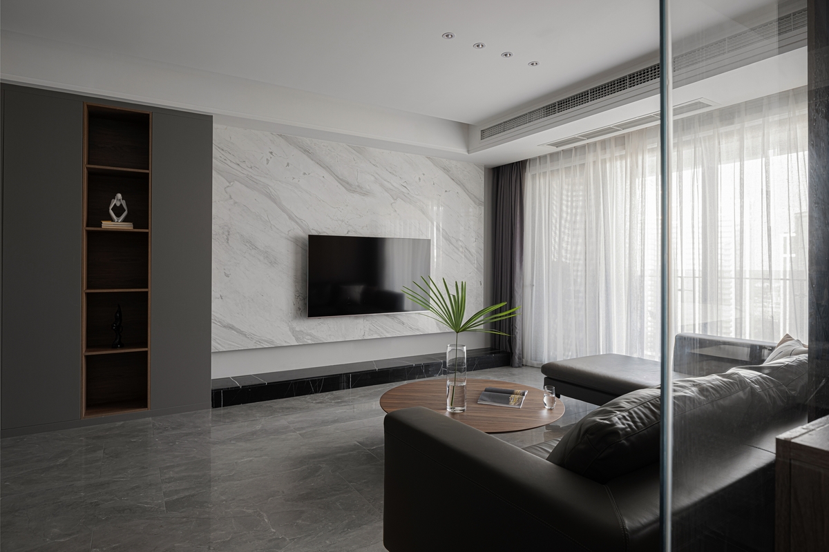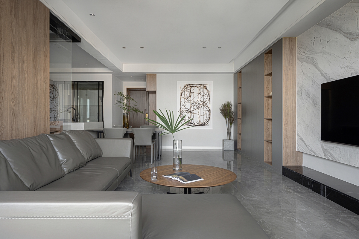 打破界限,用漸進的分界取而代之。冰川灰墻面、鋼灰色柜門、白色大理石電視墻,擬以意境表達品味。在冷靜的色彩、簡潔的線條、卓越的工藝協(xié)調下,給人以自然隨意之感,卻又讓每一處空間,都低調而不失精致。