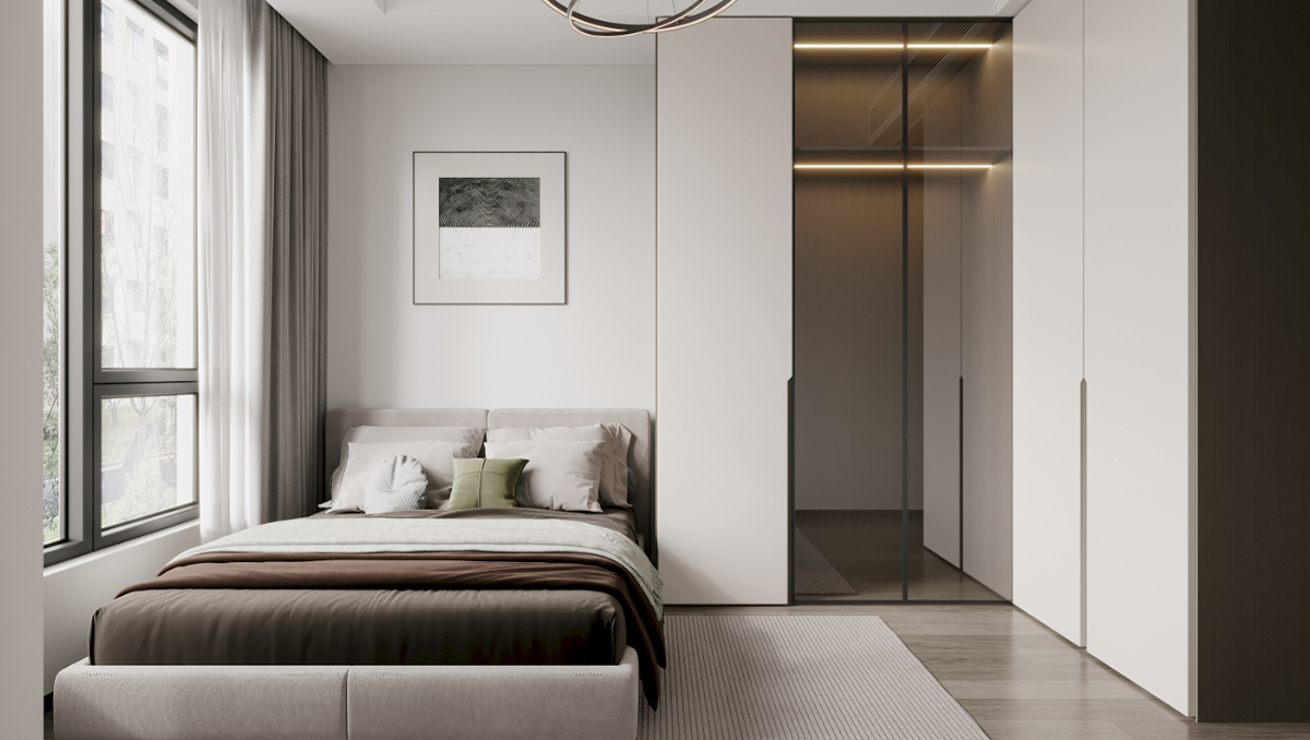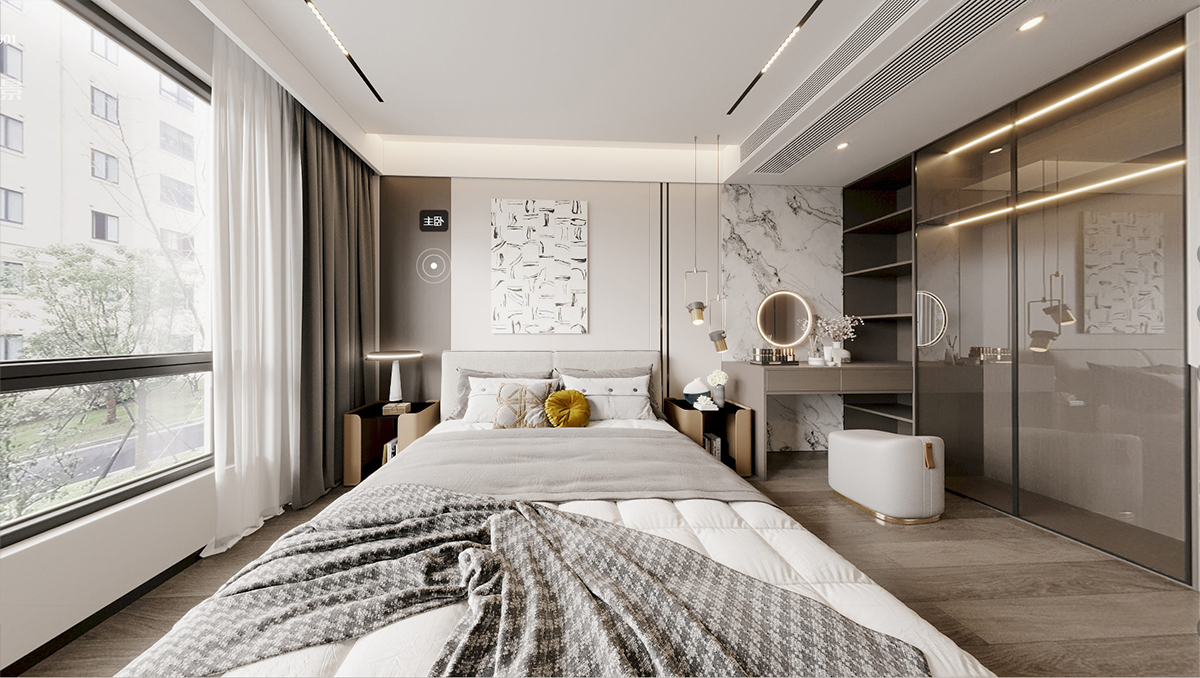 主臥透過空間的虛實(shí)處理,模糊了功能區(qū)間的界限,形成一個自由的空間,共享與私密的角色互換,既有延展過渡,又有細(xì)節(jié)疊加,襯托出豐富多元的空間情感。