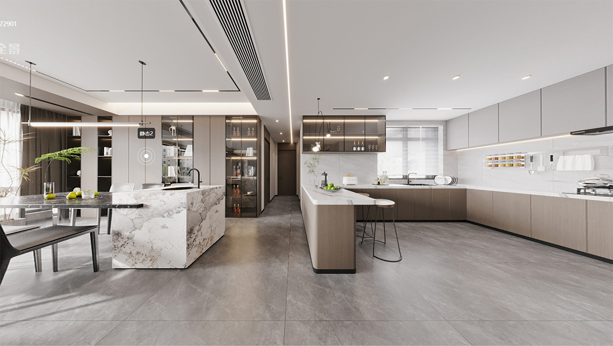 客廳以純凈的白色或黑色為底,各功能區(qū)劃分分明,又互相交合而成,匯聚一個獨(dú)具設(shè)計感的空間。會客區(qū)特意定制了案幾滿足功能與氣質(zhì)上的需求,而后錯落有序的燈光點(diǎn)綴,與戶外斜射進(jìn)來的光線相抵,結(jié)合營造了不同的韻感與雅致。