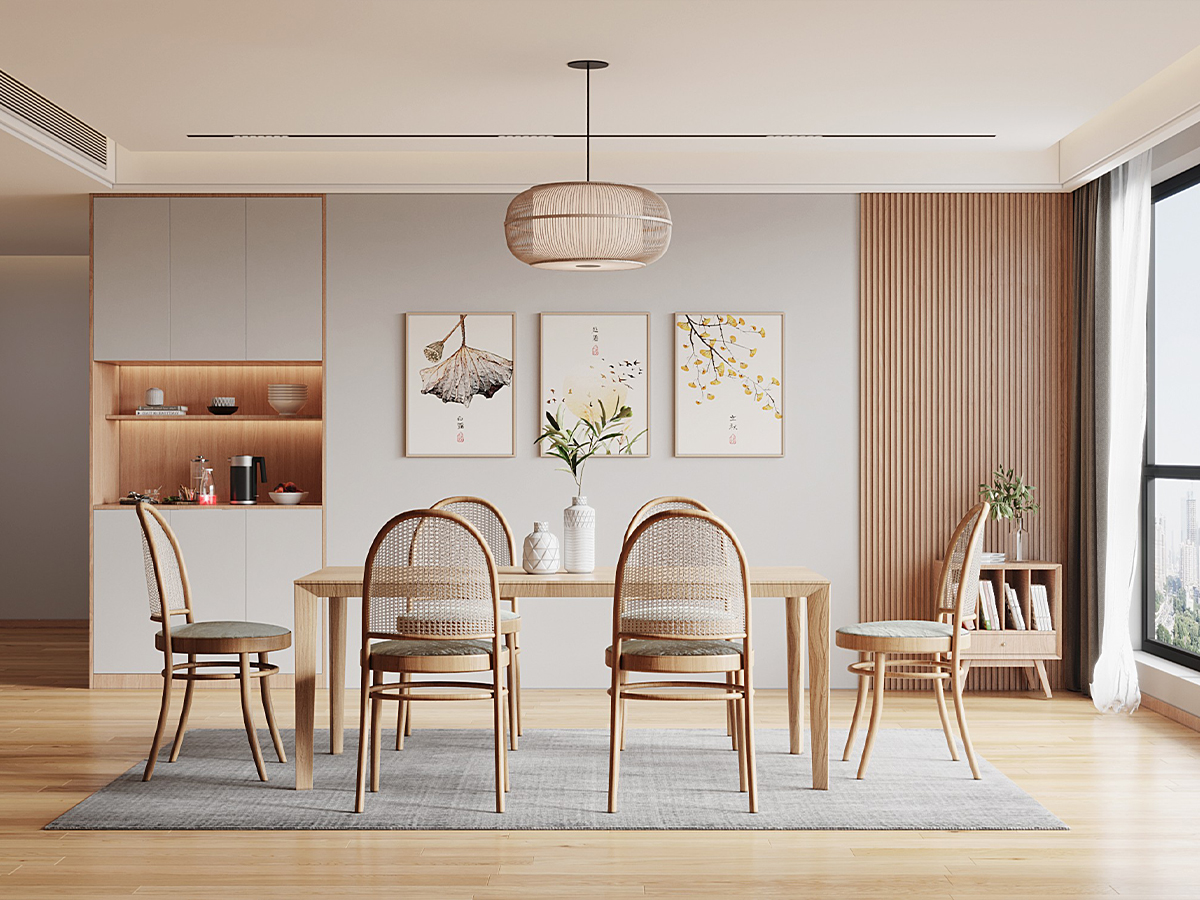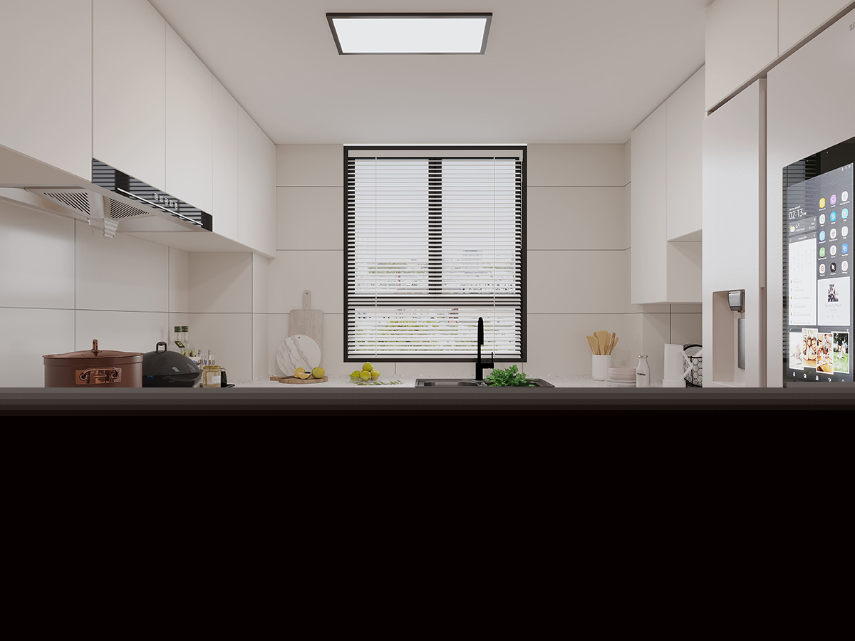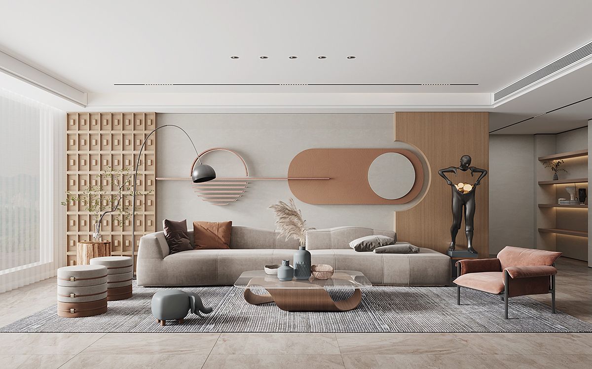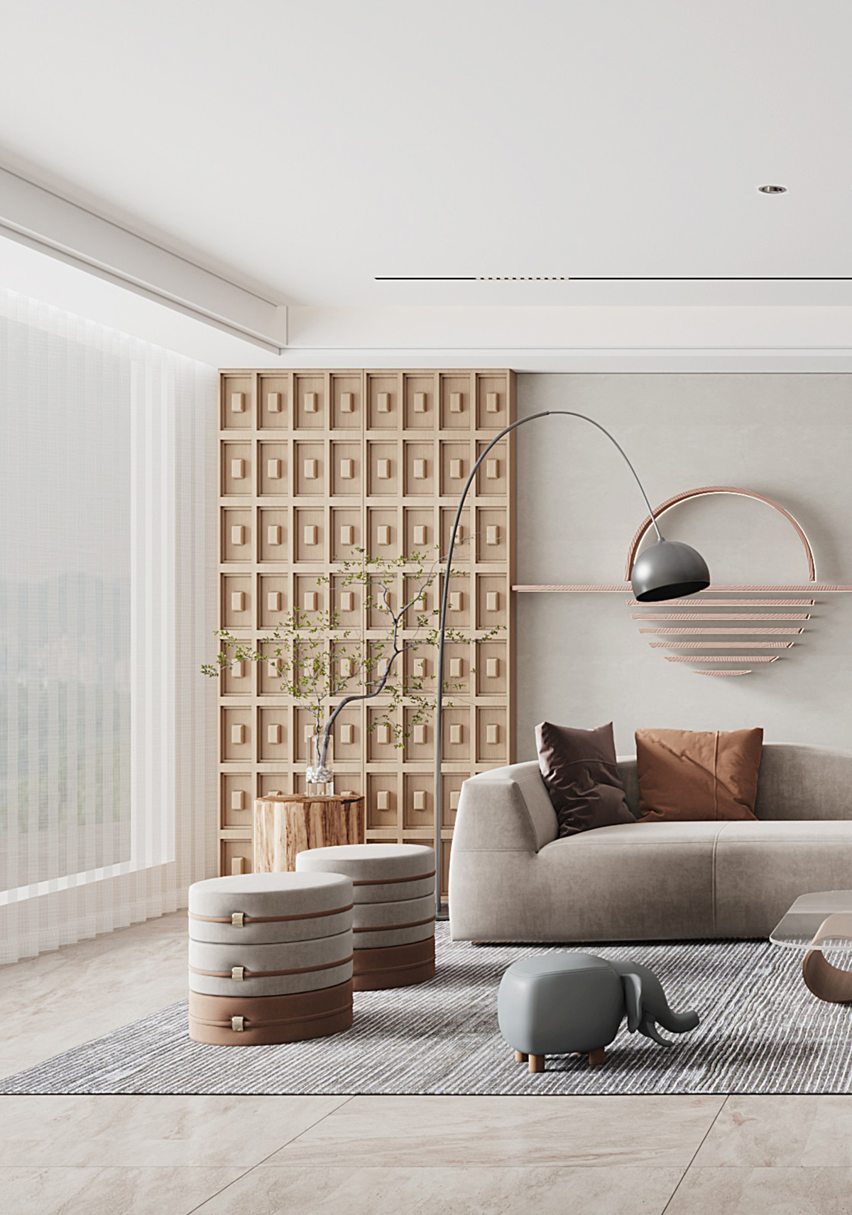 客廳以及餐廳在平行的視野里,模糊的邊界彼此作用相互借景,從地面到頂面再到墻面做了呼應(yīng)和連接,打開玻璃滑門就是一個(gè)整體,視覺和面積上大大拓展了客廳空間感。