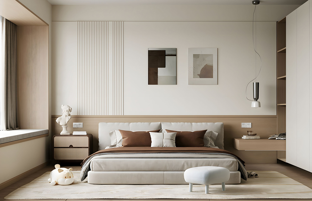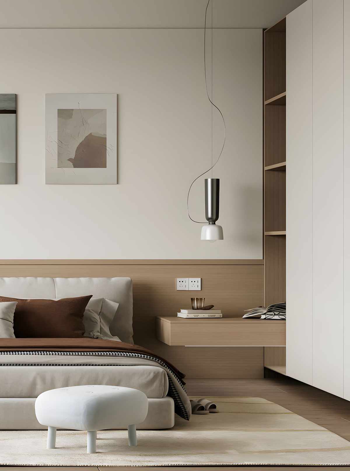 銀灰和墨綠深淺相映,營(yíng)造出盎然靈動(dòng)的空間調(diào)性,在人字拼木地板的映襯下,睡眠空間如森林般深邃靜謐。主臥配色在保持克制與冷靜的同時(shí),以藝術(shù)形態(tài)構(gòu)建回歸日常生活的意境。