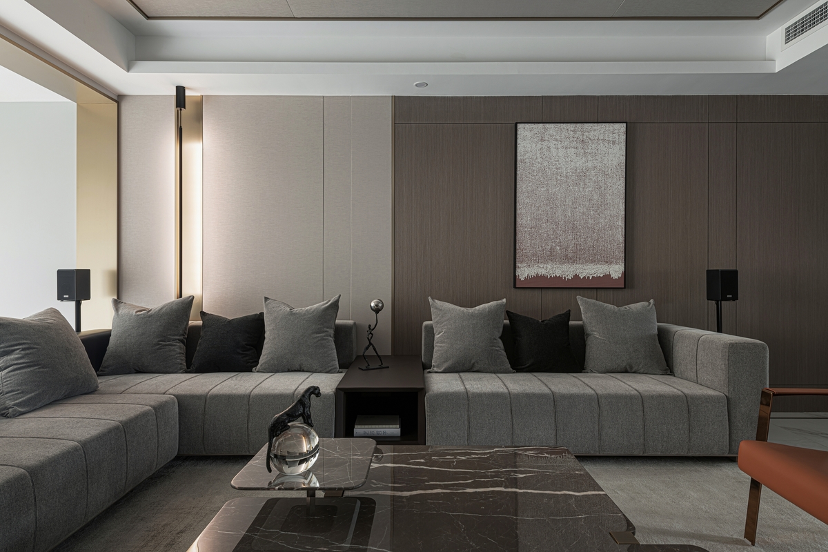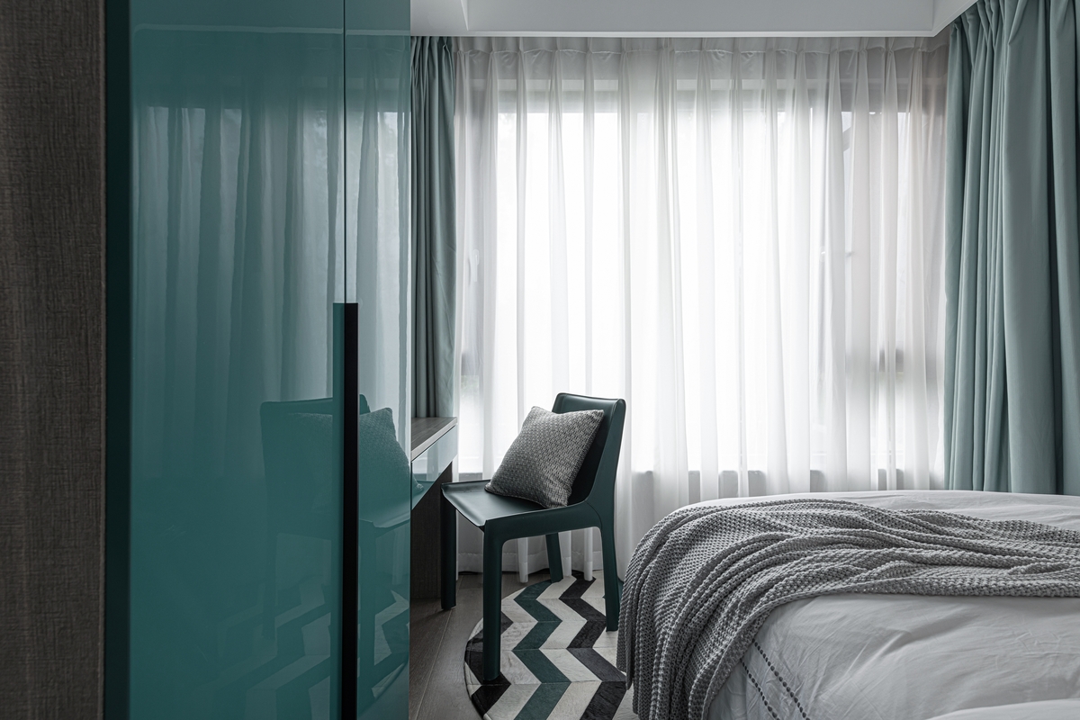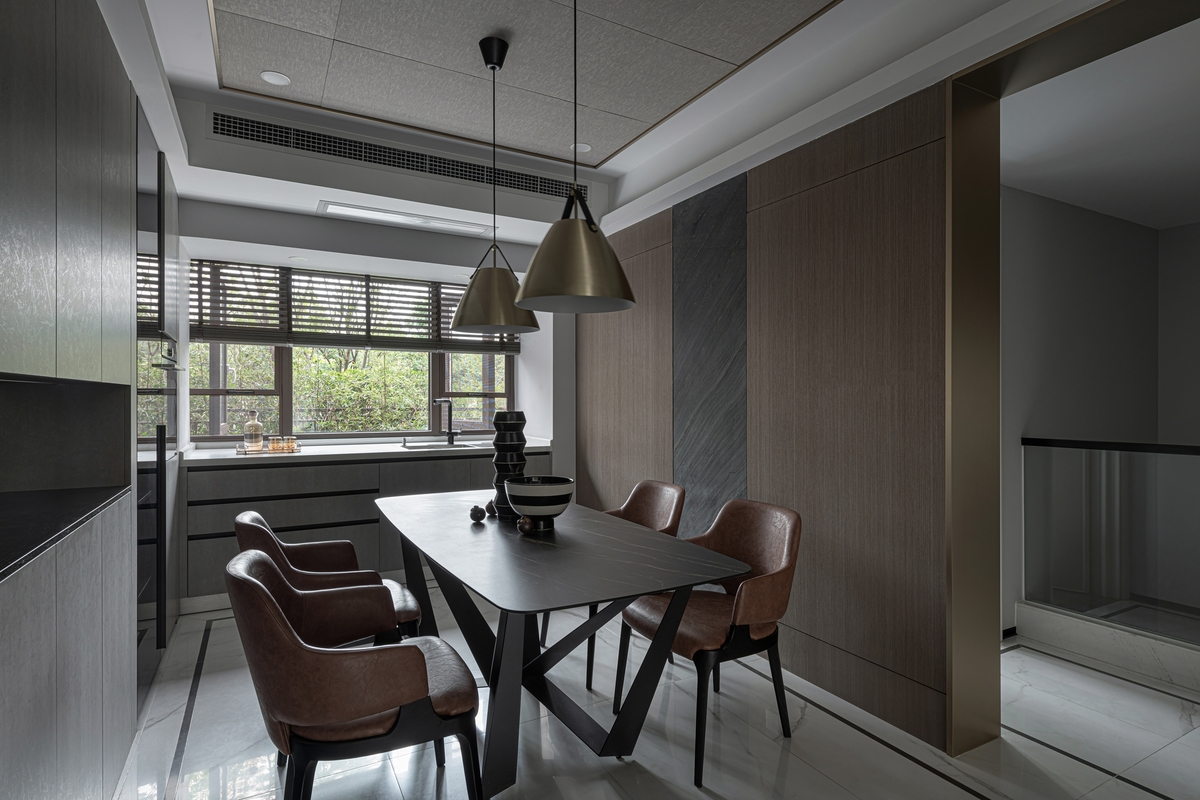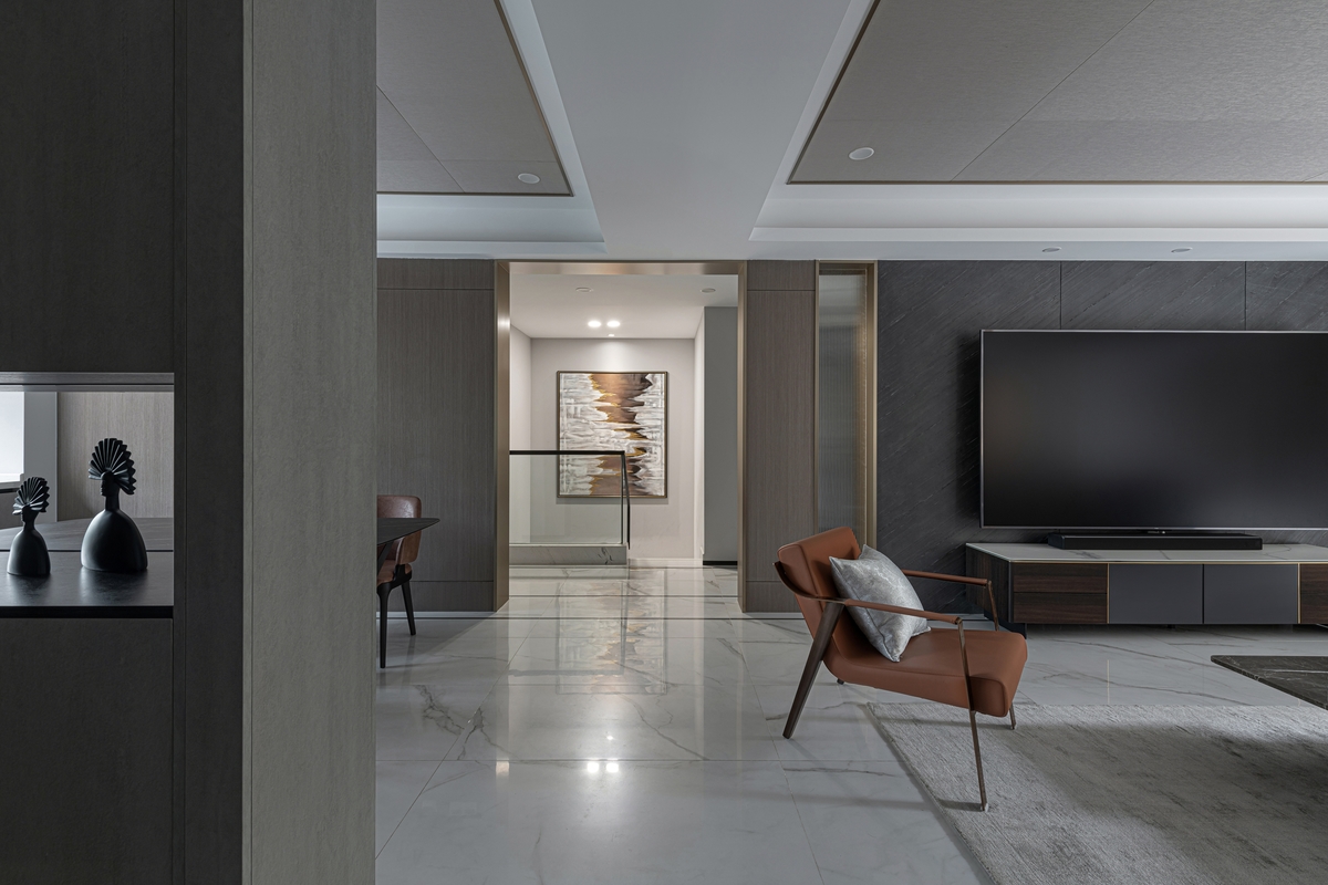 我們調(diào)整樓梯布局后客廳空間得以釋放,增加電視墻橫向尺寸,完美解決了原結(jié)構(gòu)兩面背景墻的比例分割不合理問(wèn)題。確保比例協(xié)調(diào)再利用長(zhǎng)虹玻璃獨(dú)有的透光性,營(yíng)造出若影若現(xiàn)的穿透效果。飾面材質(zhì)貫穿整個(gè)客餐廳空間,各區(qū)域相互呼應(yīng)同時(shí)保有相對(duì)獨(dú)立性,石材、金屬材質(zhì)的穿插,讓原本乏味的空間更具律動(dòng)感與趣味性。