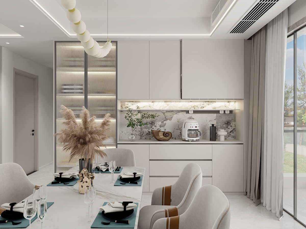 餐廳與客廳相連,長(zhǎng)方形簡(jiǎn)易款的餐桌配置不顯臃腫,餐廳背景墻上面還有打造的層次感突出的現(xiàn)代輕奢掛畫(huà),加上柔和的燈光讓整體的空間沒(méi)有那么的單調(diào),餐邊柜與水吧一體柜玻璃柜門(mén)配置能夠讓酒柜的顏值更高,內(nèi)部的美酒在燈光的照射下能夠顯示出五顏六色的色調(diào)和美麗的身姿,每一件工藝品都散發(fā)著自己獨(dú)特的魅力,為餐廳增添不一樣的氛圍。
