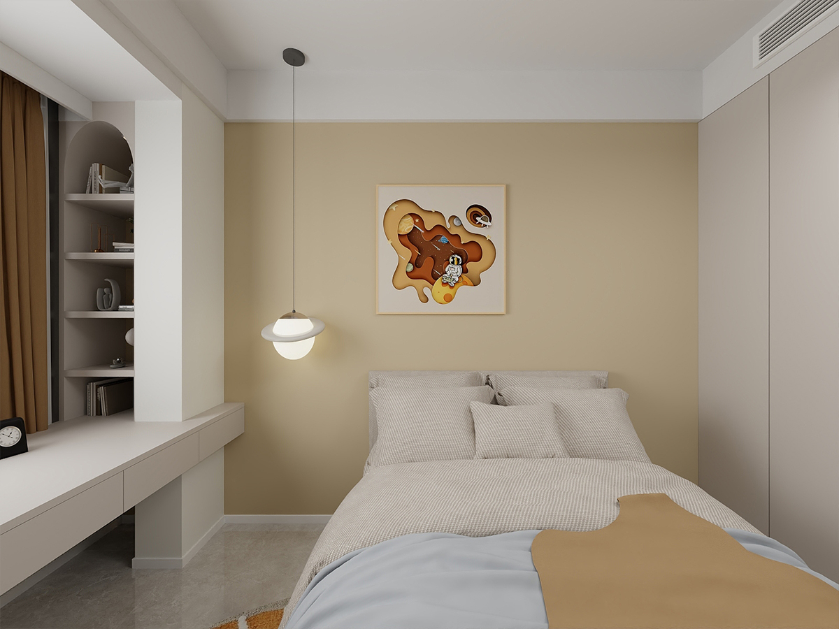 整個(gè)空間大氣又明朗,合理利用了飄窗臺(tái)做了個(gè)書(shū)桌,又具有一定的展示功能,,不顯得空間偏暖色調(diào)且床頭背景墻做了個(gè)茬色調(diào)整使整個(gè)空間溫馨又舒適。