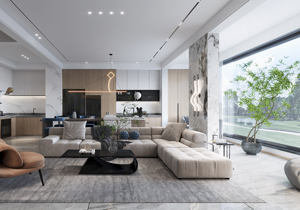 客廳的第一視覺便是寬闊感,空間的舒適度最大化的利用。大大的落地窗,透光的白紗窗簾搭配奶白色遮光簾,拉開可以欣賞美景,拉上又可以舒舒服服的休息。