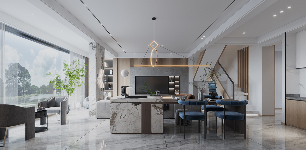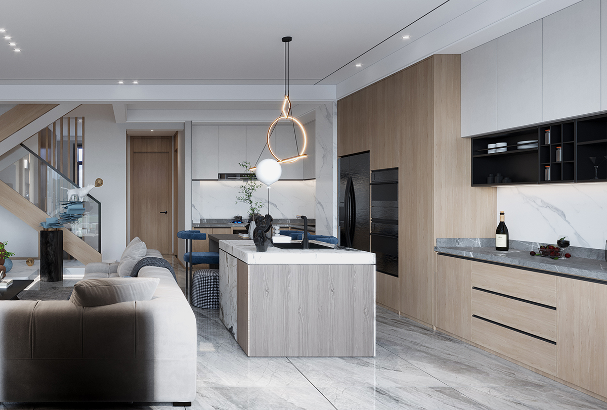 開放式廚房搭配餐導(dǎo)臺相呼應(yīng)。采用了巖板以及大理石做點(diǎn)綴,呼應(yīng)了整體的主題色調(diào),極具設(shè)計(jì)感。