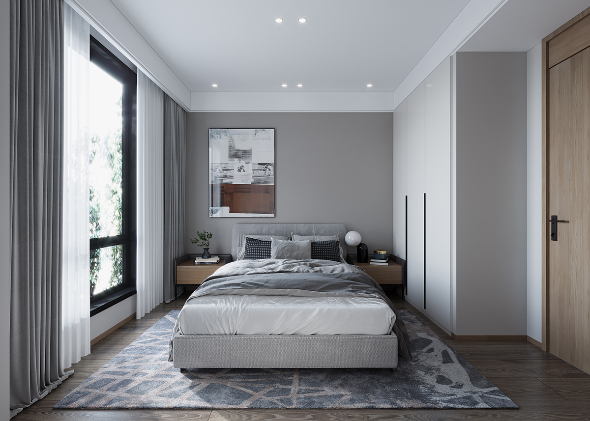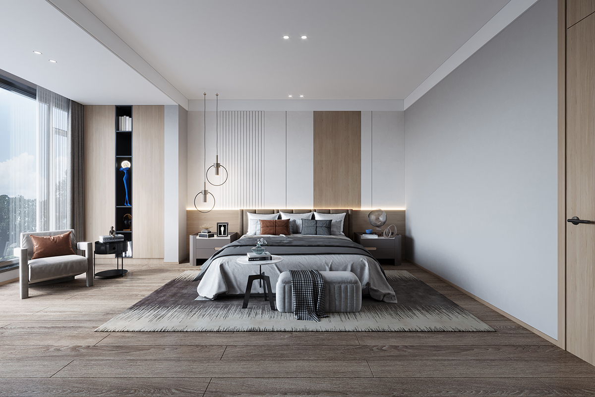 主臥整體溫馨簡約,以及護(hù)墻板點(diǎn)綴,吊頂走了一圈雙層石膏板走邊,簡單大方。