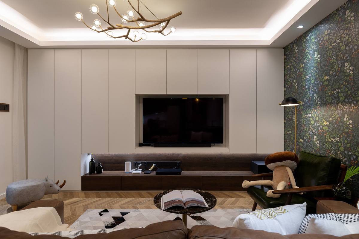 一整面純白的立柜作為電視背景墻,強(qiáng)大的儲物空間,下方留空用于放置路由器等小電器,左邊立柜留出作為鞋柜使用。中間留空,電視嵌入其中,相框式的造型。充分運用自然元素,樹枝造型的吊燈完美地融入空間。