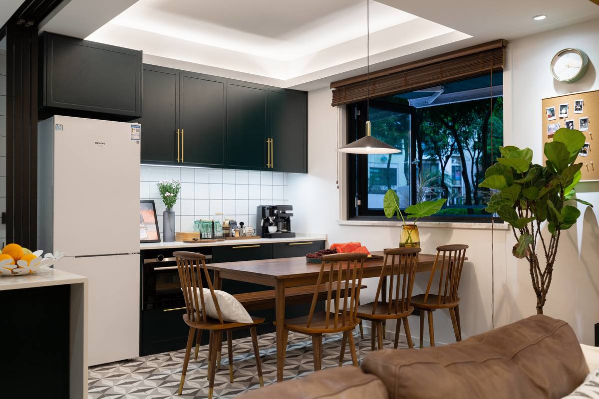 角落的玻璃移門也是可以移動的,完全不存在衛(wèi)生死角。木質(zhì)的百葉窗,提升了廚房的質(zhì)感。