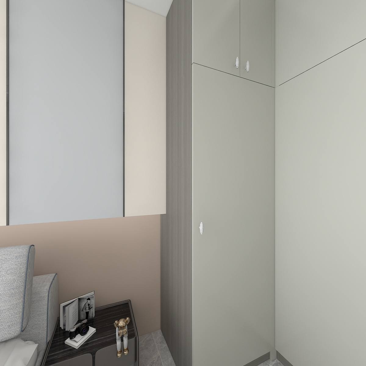 主臥同樣選擇用低飽和的奶白色打底,石膏線、石膏燈盤無言刻畫空間的精致感,床尾規(guī)劃一整排衣柜,豐滿收納力,雙層窗簾調(diào)節(jié)空間明亮。