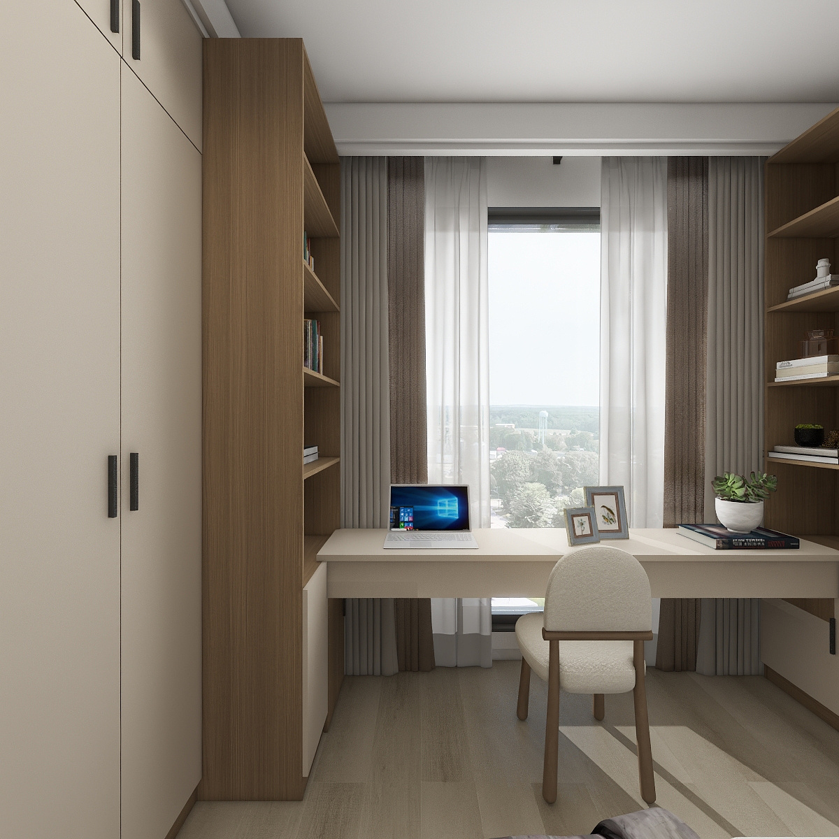 想要一個(gè)簡略寂靜的空間就要保持干凈純粹的本貌,溫潤原木背景,家里孩子比較多,臥室增加了一部分書桌代替床頭柜搭配簡約造型的床架整個(gè)臥室空間更顯輕盈。
