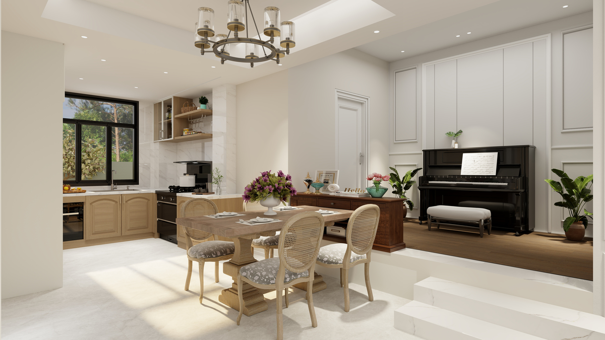 餐廳擺放的是原木色的餐桌椅,在淺灰色的地面上,餐桌上擺著優(yōu)雅的高腳杯與果盤(pán),點(diǎn)綴出一種華麗端莊的檔次感。