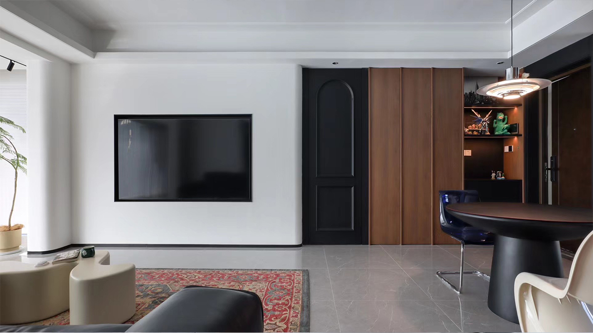 客廳樓梯間整個(gè)空間最富有設(shè)計(jì)感的一處區(qū)域,精巧的利用巖板與石材拼接再加上燈帶裝飾,頂面利用鏡面鋁材制作出水波紋的效果,使其開(kāi)起來(lái)像是倒影在水面,顯得生動(dòng)有趣,簡(jiǎn)潔的直線配上石材紋理讓整個(gè)空間顯得大氣、整潔,不規(guī)則的樓梯間隔斷分隔開(kāi)客廳,雖然使用的是硬朗的線條,但也不顯得突兀更有一種獨(dú)具一格的風(fēng)格,可以為空間注入深度,增加設(shè)計(jì)感;皮質(zhì)的沙發(fā)與布藝矮凳搭配更顯質(zhì)感,富有藝術(shù)感的茶幾和燈具修飾,整潔而不失格調(diào);在整體空間的基礎(chǔ)上合理運(yùn)用了黑白灰三色等軟裝,為這個(gè)家增添了舒服輕松的氛圍