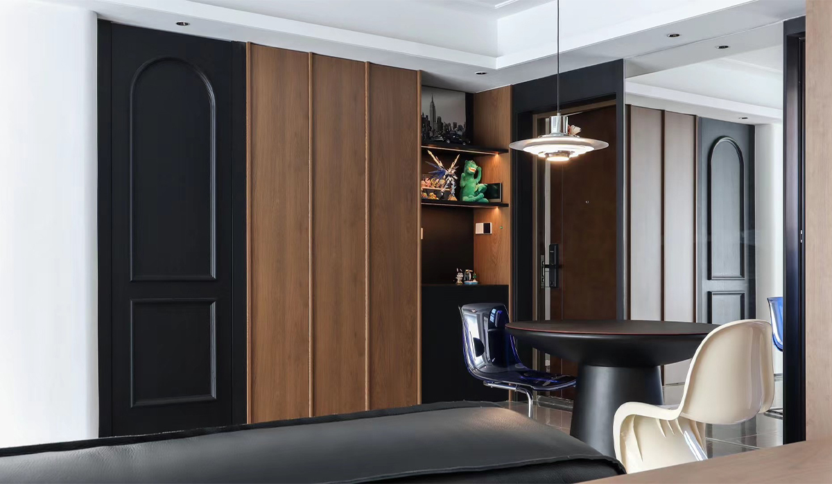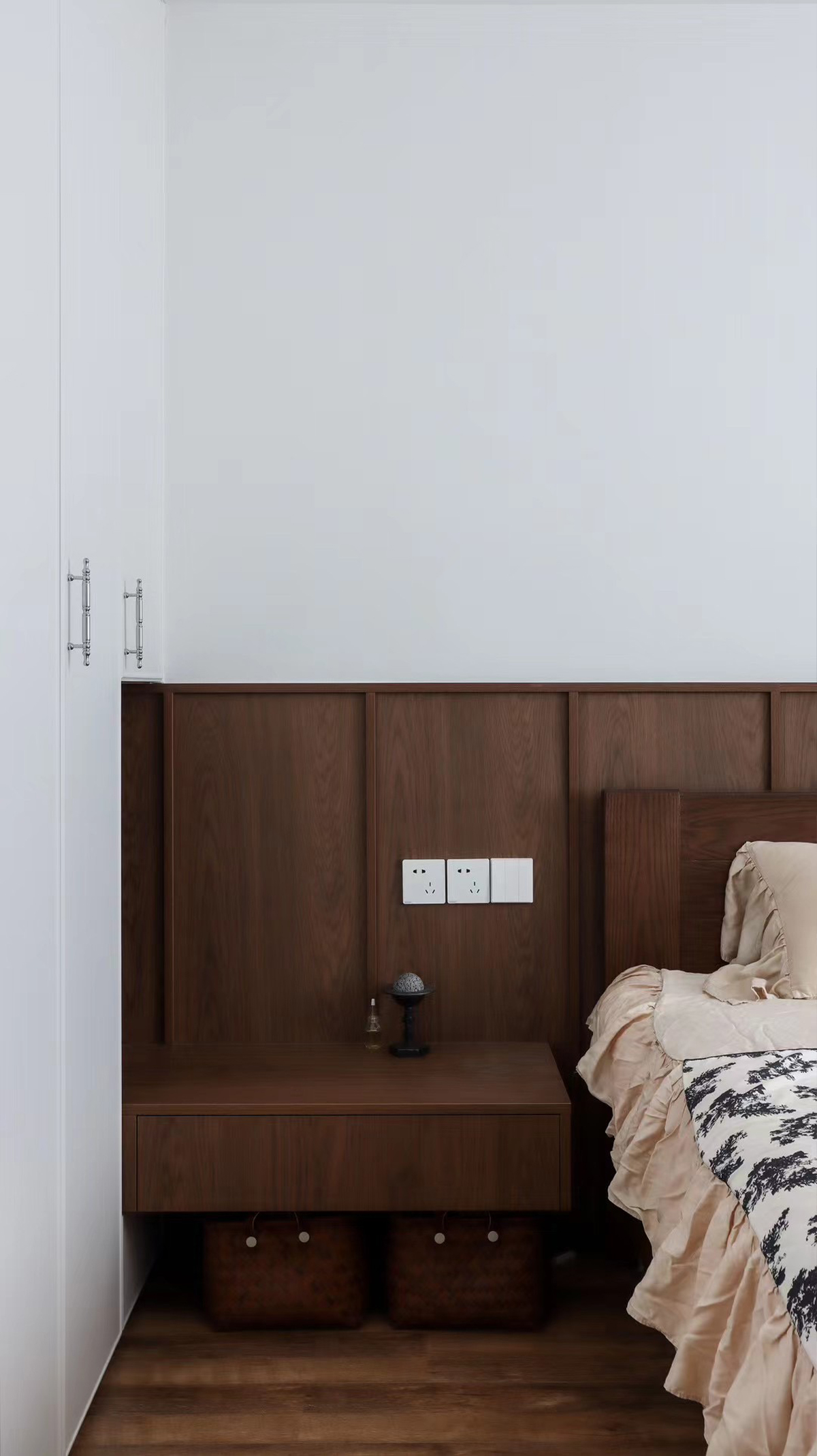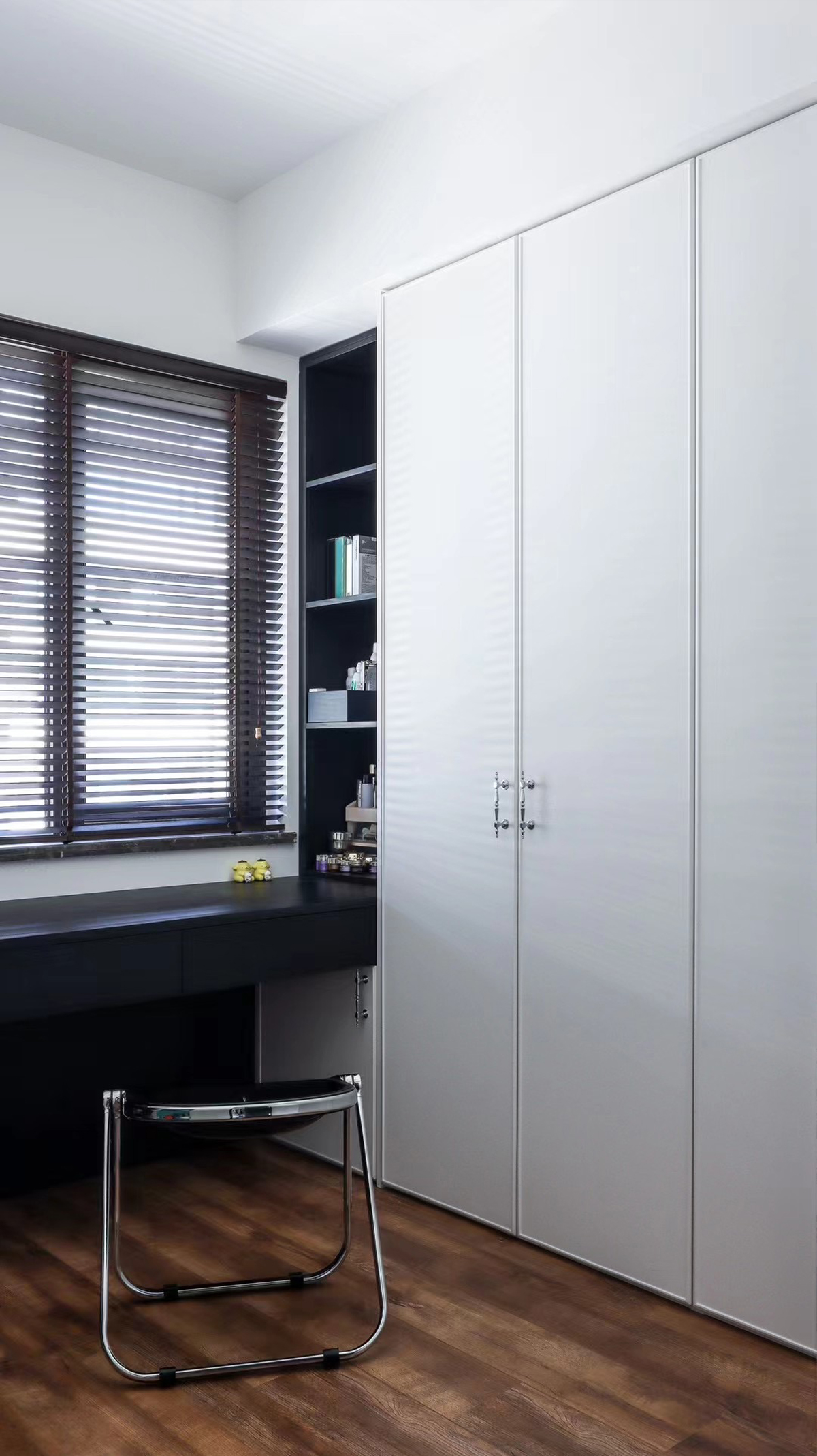 主臥簡(jiǎn)約治愈,整體風(fēng)格溫馨舒適。主臥使用深棕色的木地板更顯溫馨,白色的門(mén)板加上金屬感的拉手,既使空間看起來(lái)美觀也不會(huì)太過(guò)單調(diào),從衣柜延伸出來(lái)的跳板能夠?qū)崿F(xiàn)美觀,不占空間,儲(chǔ)物的功能,主臥的床頭加了木質(zhì)護(hù)墻板使整體空間更富有溫馨的氛圍。