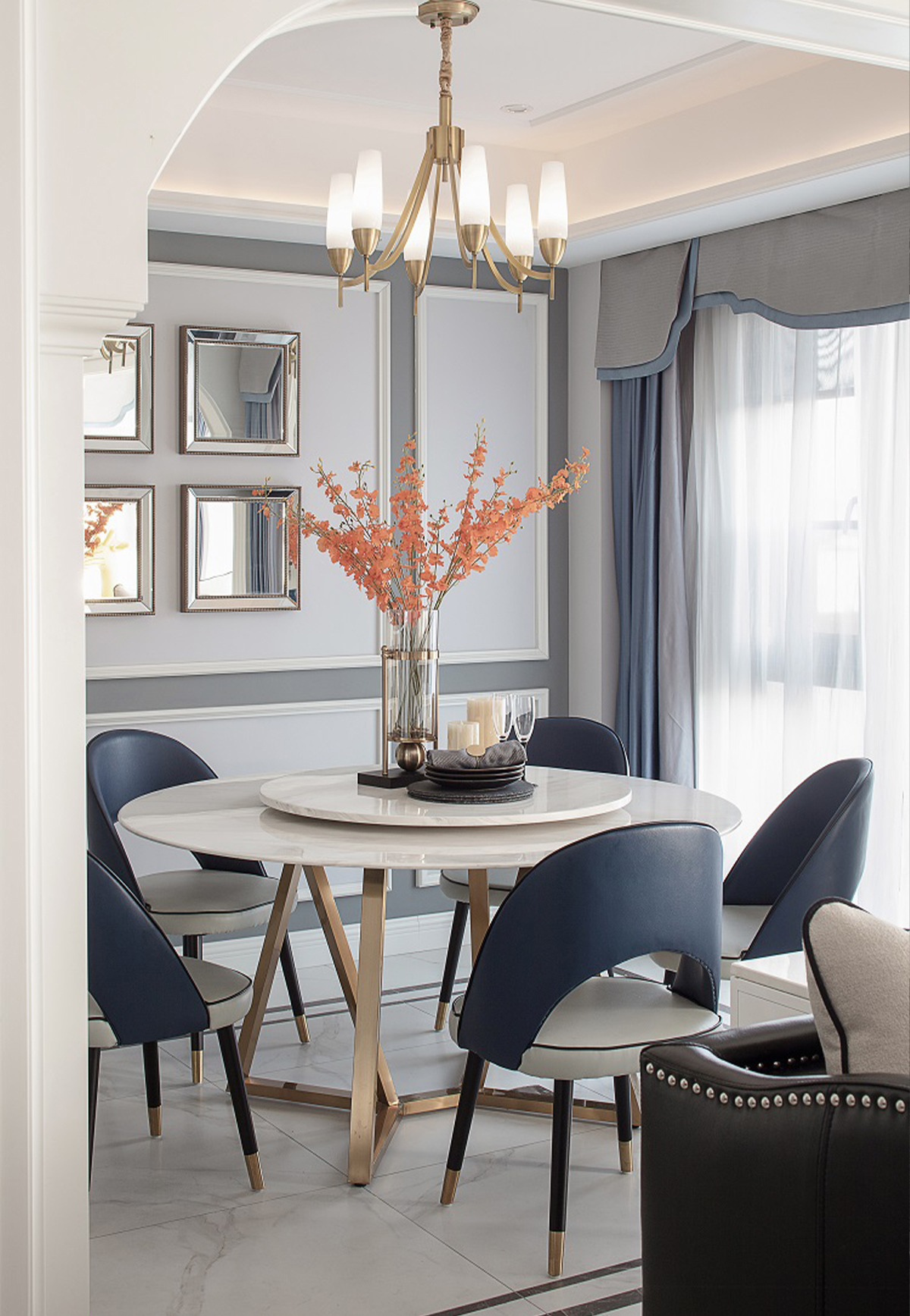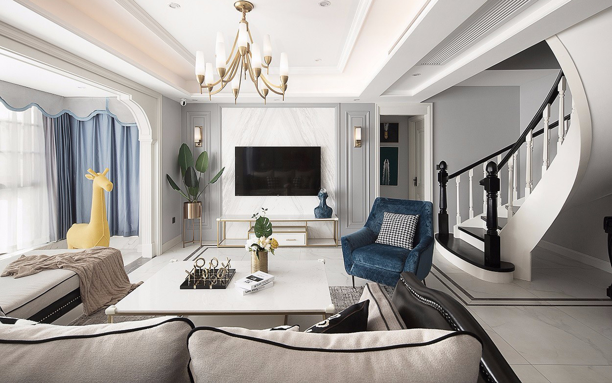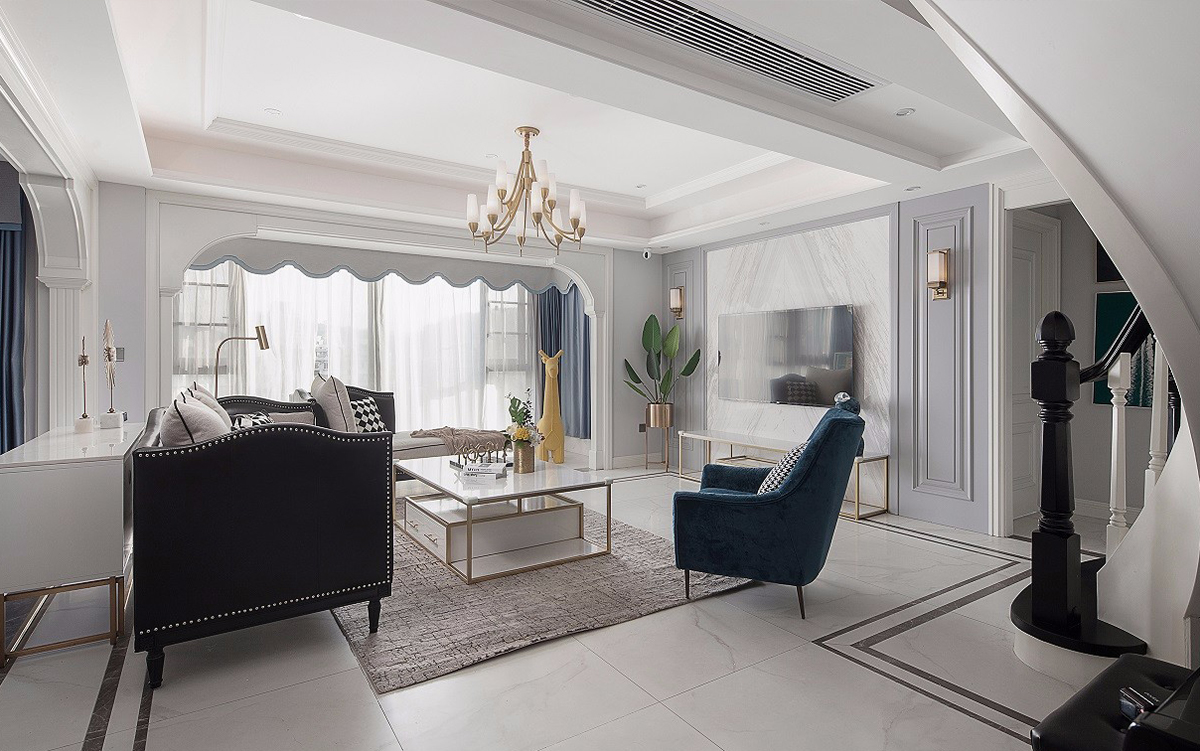 美式客廳風(fēng)格較多采用嵌入式石膏吊頂,搭配精致的水晶吊頂,營(yíng)造出一種懷舊、浪漫的感覺(jué)。以 大理石 作為地面裝飾材料,光澤感佳,在沙發(fā)區(qū)鋪上大幅花紋 地毯 ,使空間區(qū)域劃分更加清晰。復(fù)古造型的組合沙發(fā),以及茶幾都具有上乘的質(zhì)感,讓美式古典風(fēng)格得以進(jìn)一步的彰顯。