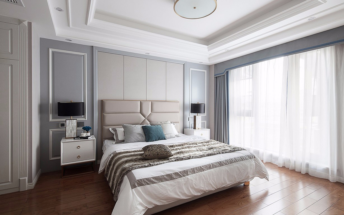 美式家居的臥室布置較為溫馨,作為主人的私密空間,主要以功能性和實(shí)用舒適為考慮的重點(diǎn),一般的臥室不設(shè)頂燈,多用溫馨柔軟的成套布藝來(lái)裝點(diǎn),同時(shí)在軟裝和用色上統(tǒng)一。