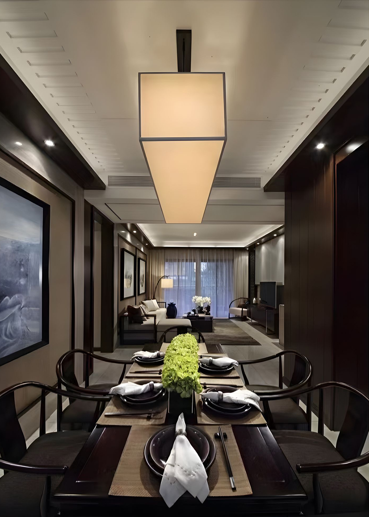 餐廳運(yùn)用細(xì)膩的原木以及特殊的色彩進(jìn)行巧妙搭配,簡(jiǎn)約線條的新中式家具為空間增添了幾分傳統(tǒng)文化的韻味,空間散發(fā)著人間煙火的氣息。