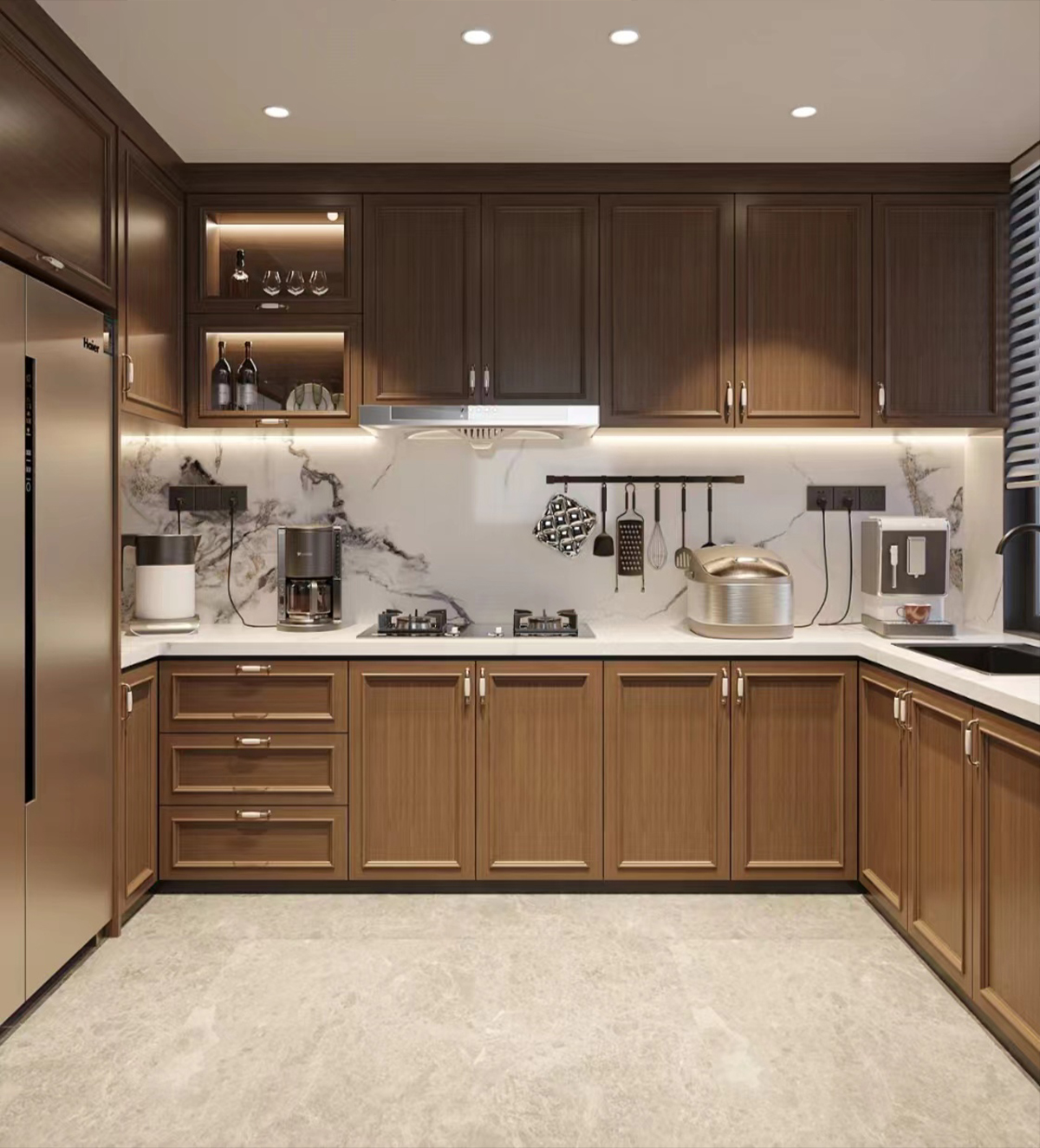 廚房的整體設(shè)計(jì)以深棕色為主色調(diào),營(yíng)造古風(fēng)感而且深色的色調(diào)不容易顯臟,地面運(yùn)用淺灰色的地磚,深淺搭配,整體觀感充滿中式韻味。