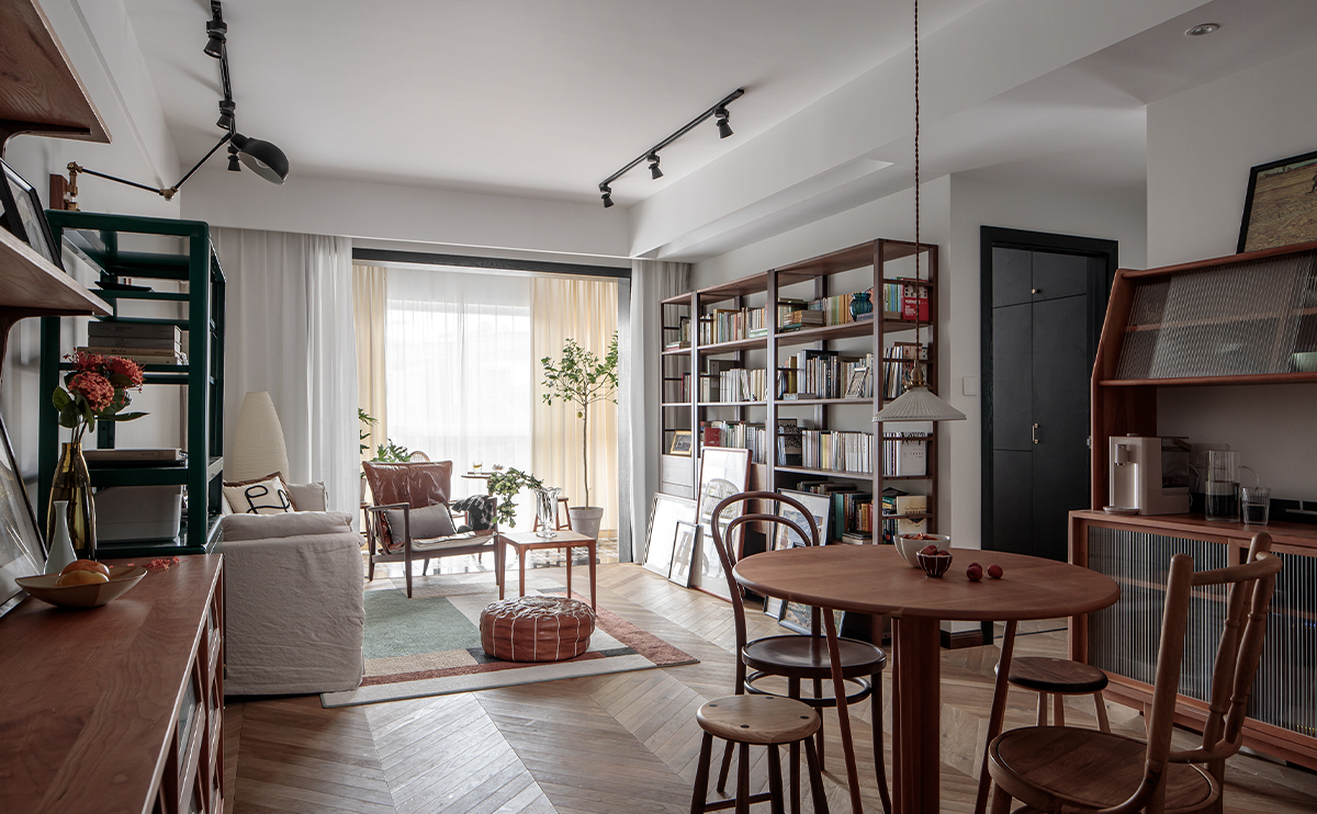 餐廳以櫻桃木為主作為呈現(xiàn),自然弧度的復(fù)古家具與經(jīng)典造型的木凳,在整體陳設(shè)分類中,將不同屬性的物件有序地連接成一個(gè)氣氛整體。利用圓桌進(jìn)行焦點(diǎn)聚攏,暖黃色燈光營(yíng)造溫馨的日式就餐氛圍。到了就餐時(shí)間,飯菜的香氣好像立刻就會(huì)撲鼻而來(lái)。