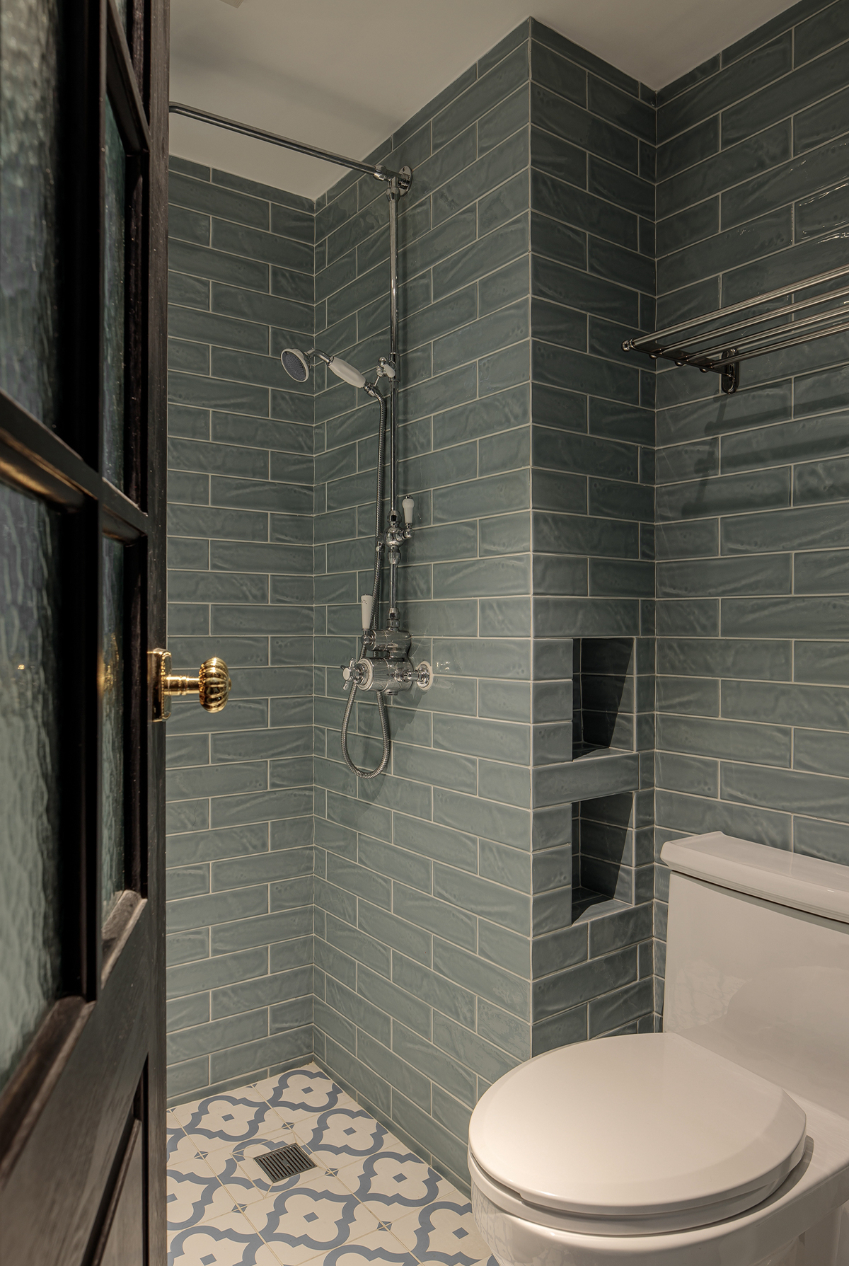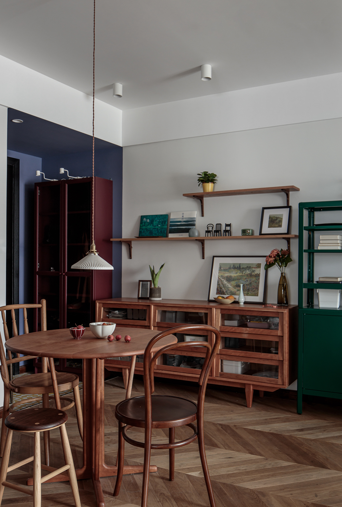 用小蒼藍(lán)黃花紋地磚與墻面矢車菊藍(lán)進(jìn)行局部碰撞,加入絳紫色的成品玻璃展示鞋柜,營(yíng)造復(fù)古氣氛。玄關(guān)使用智能開關(guān),當(dāng)2700k燈光亮起來(lái)的時(shí)候,是她心中的一種情懷。